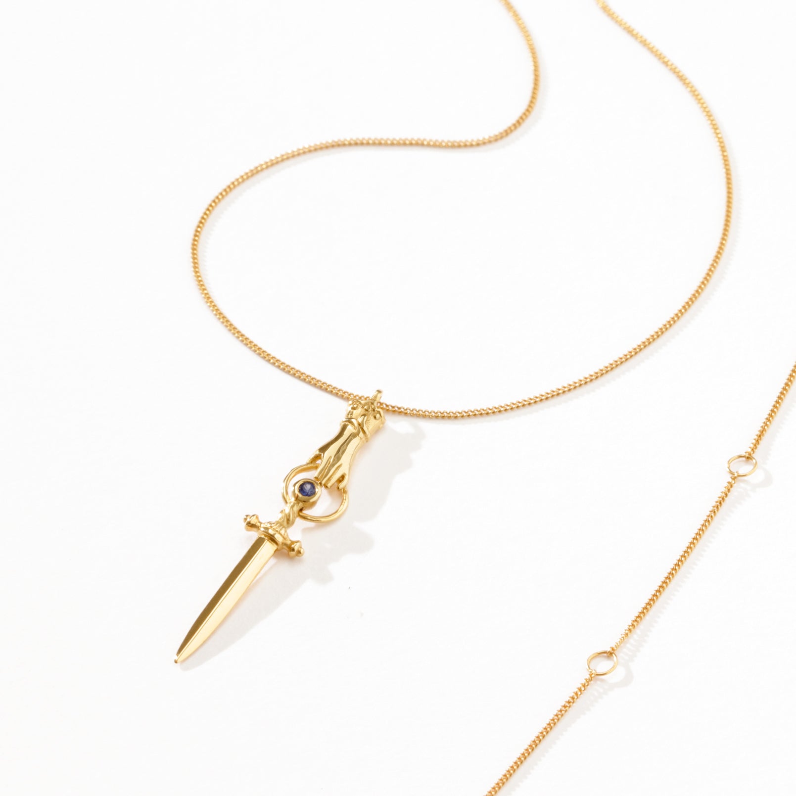 The Alexa Necklace in 18K Gold Vermeil is inspired by Victorian motifs of a hand and sword. Named 'Alexa' which translates to 'protector of Mankind' in Greek, the hand symbolises loyalty and strength with the sword representing protection, strength, and courage. A delicate round cut Blue Sapphires speaks to wisdom, intuition, and spirituality.
