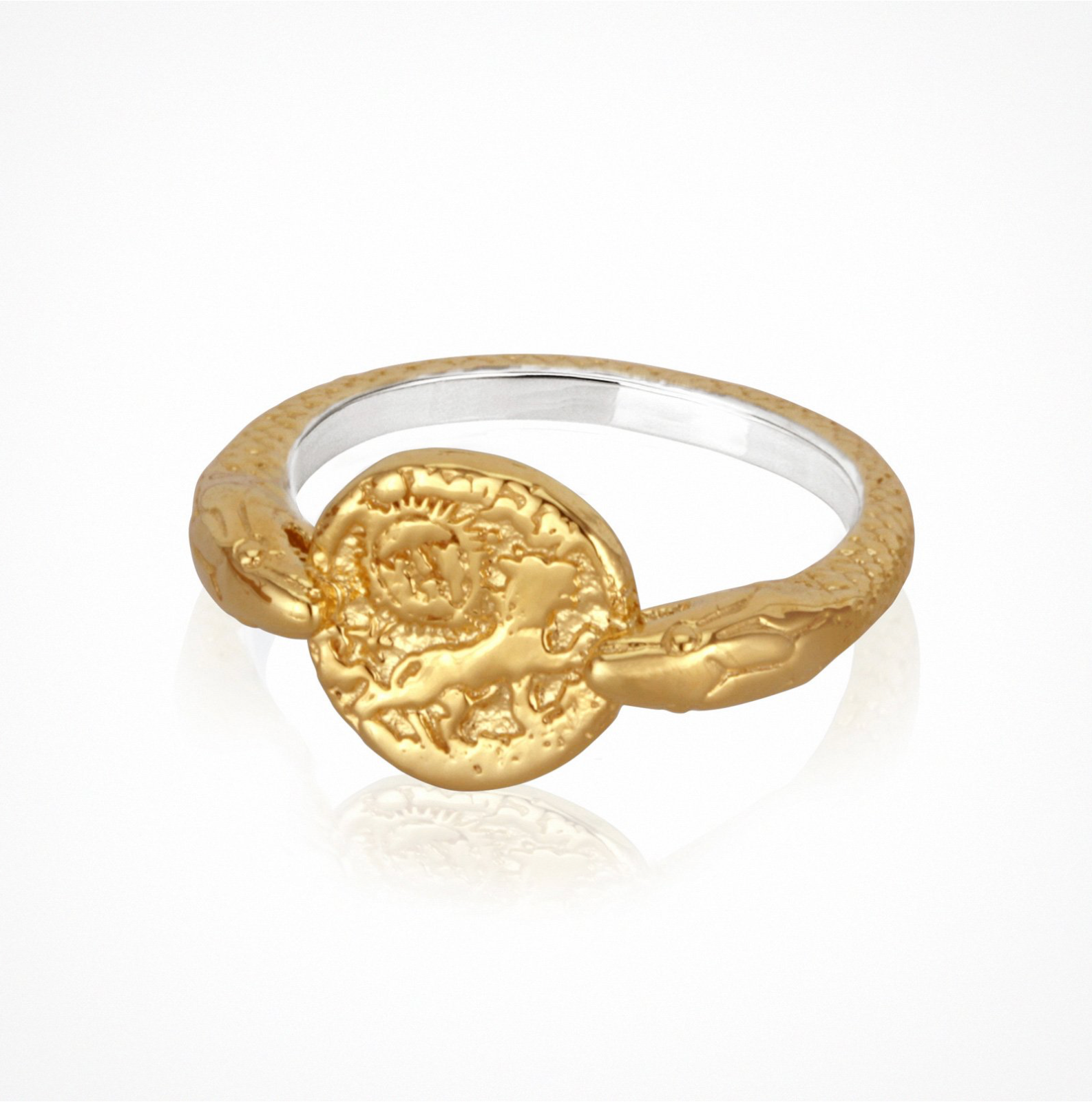 Aria, the most beautiful mortal woman on the island of Crete, calls upon the sun for creativity and the power to meet the challenges in her everyday life. For her, the lion symbolises honour and truth, giving herself the courage to speak the truth. The Aria Ring, in polished 18k Gold Vermeil, has all of these symbolic meanings engraved into the medallion which sits as the centrepiece of the ring; reminding us that we can bask in the creative warmth of the sun and the honour of the lion whenever we feel called too.