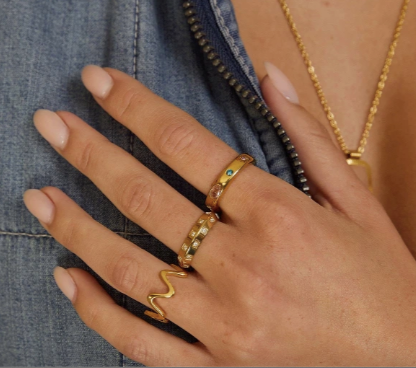 Stunning shimmering style perfectly describes the Nelly Ring! This beautiful golden band, featuring colourful stones, is the perfect elegant addition to your everyday ring stack.