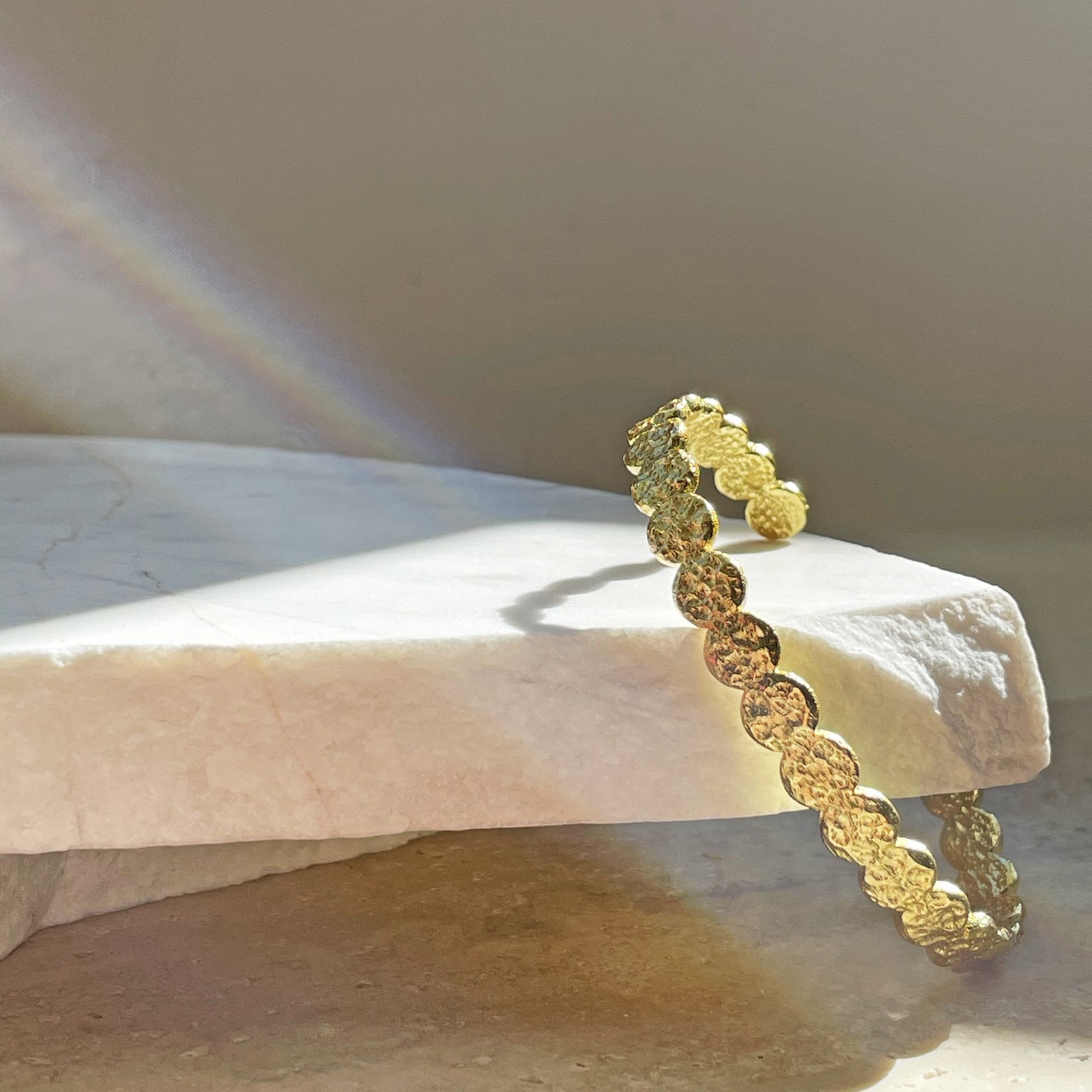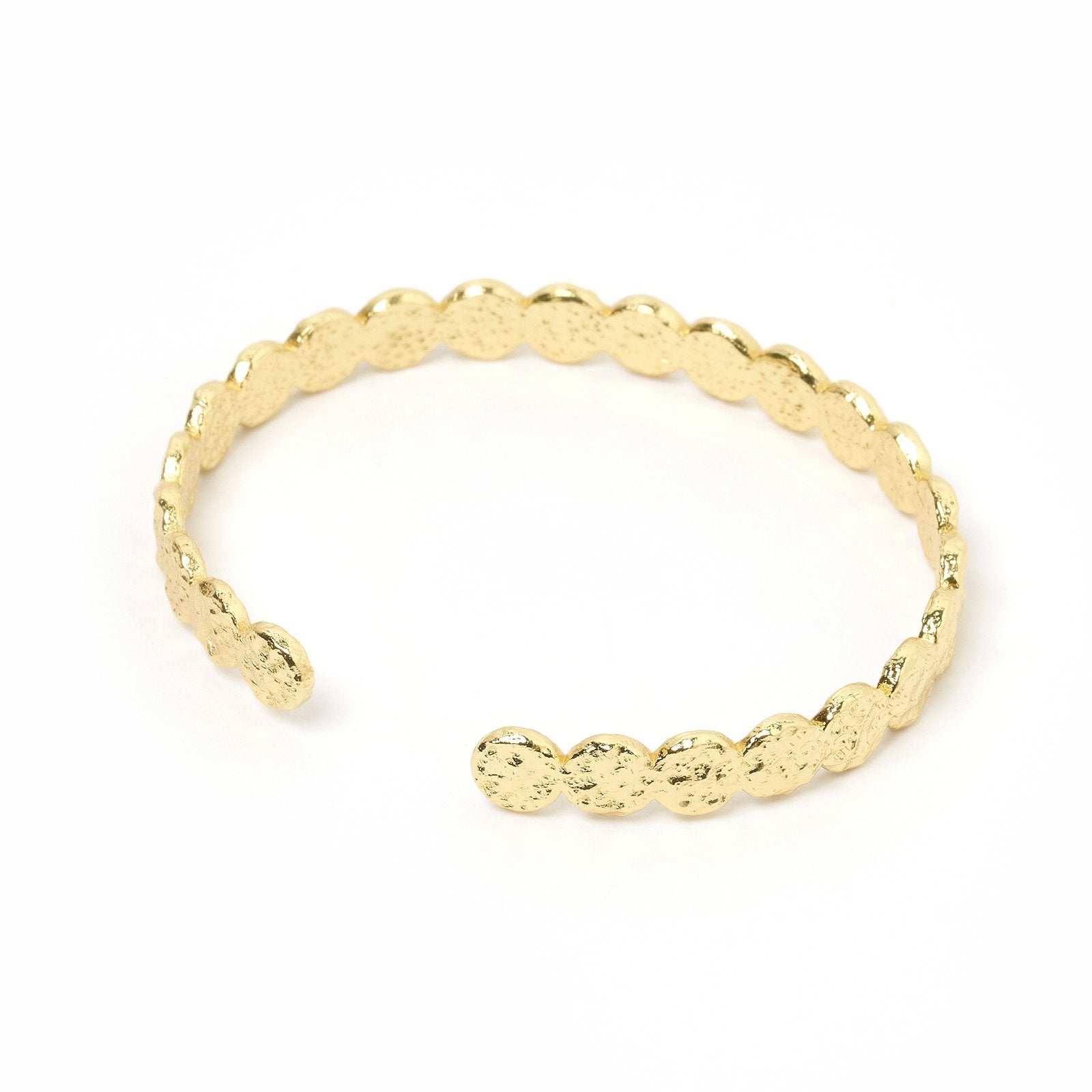 From ring to cuff, the Olsen story continues! With its unique crushed gold discs coming together in a malleable cuff to fit all, this bracelet will be the final touch adding to the outfit of your dreams.