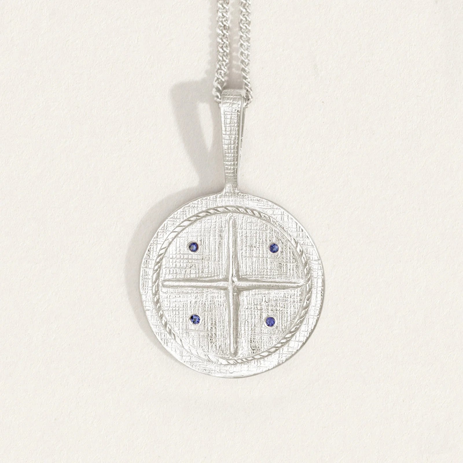 The cross brushed coin necklace is divided into four quadrants by two intersecting lines, with a round cut Blue Sapphires sitting within each section. Sapphires speak to wisdom, intuition, and spirituality. The Atlas Necklace is a reminder to listen to and trust your own intuition, charting your own course in life.