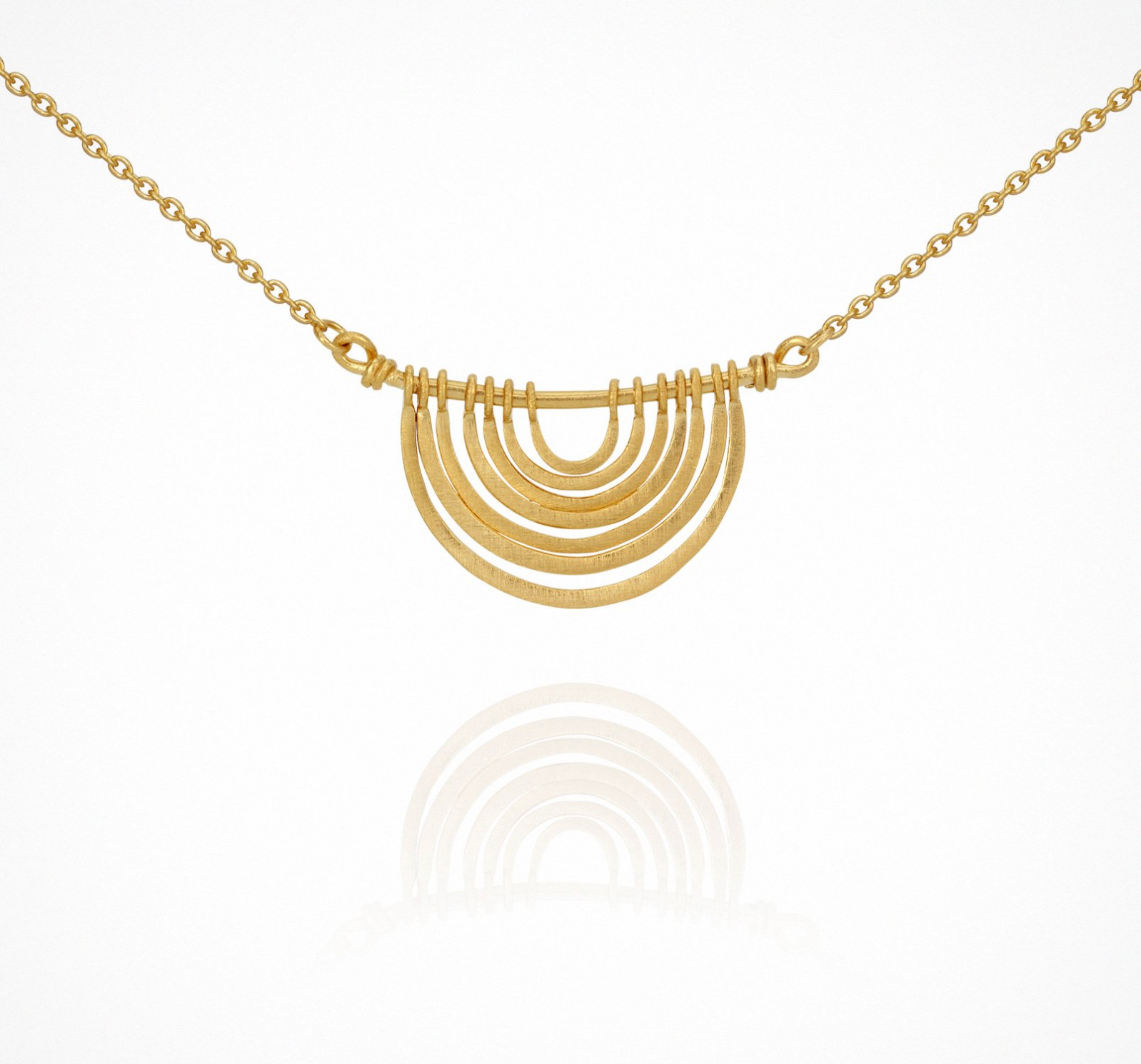 A fine looped chain meets in the middle of the Baye Necklace to hold seven soft golden hand brushed differing semicircles that sit symmetrically and chime together. A delicate piece to layer with or sit daintily on its own.