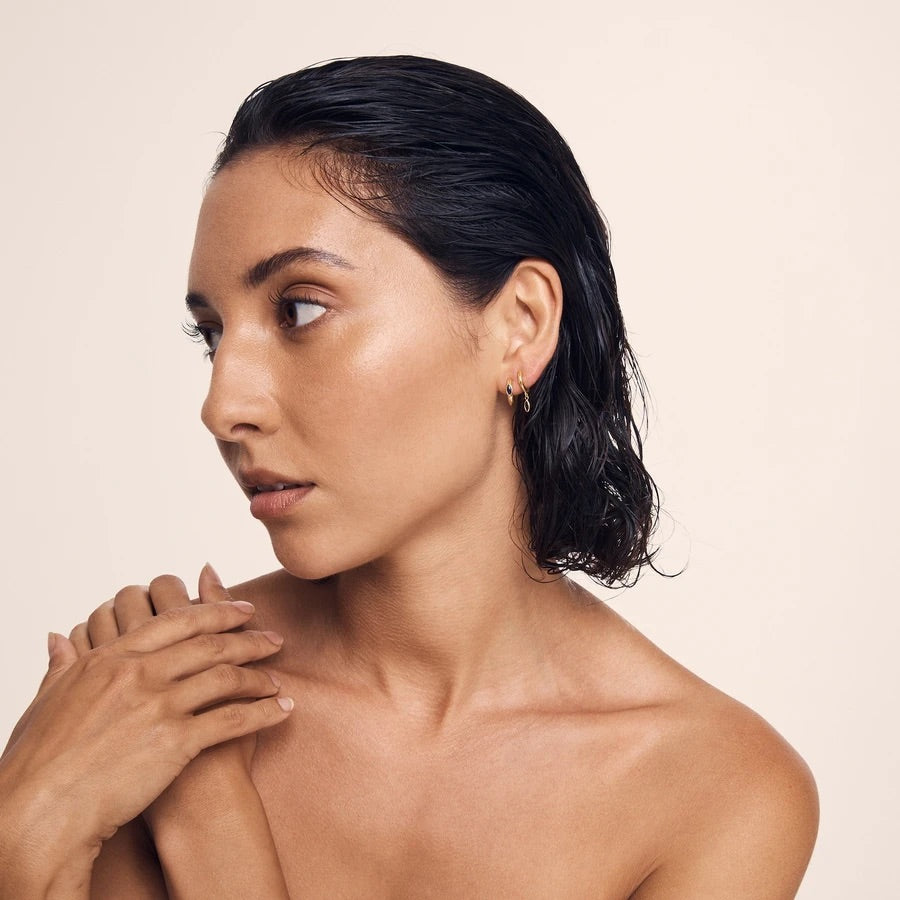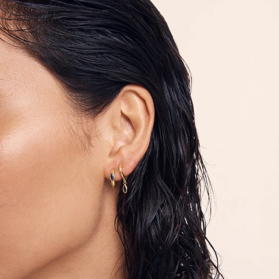 The Chrysalis Earrings in 18K Gold Vermeil are a classic gold small hoop with Eye motif in Blue Sapphire. Both the Eye symbol and Sapphire represent wisdom and knowledge, imparting insight and protection upon the wearer. Chrysalis is a symbol of protection during periods of transition and growth, the Blue Sapphire brings wisdom, insight and protection to this journey.