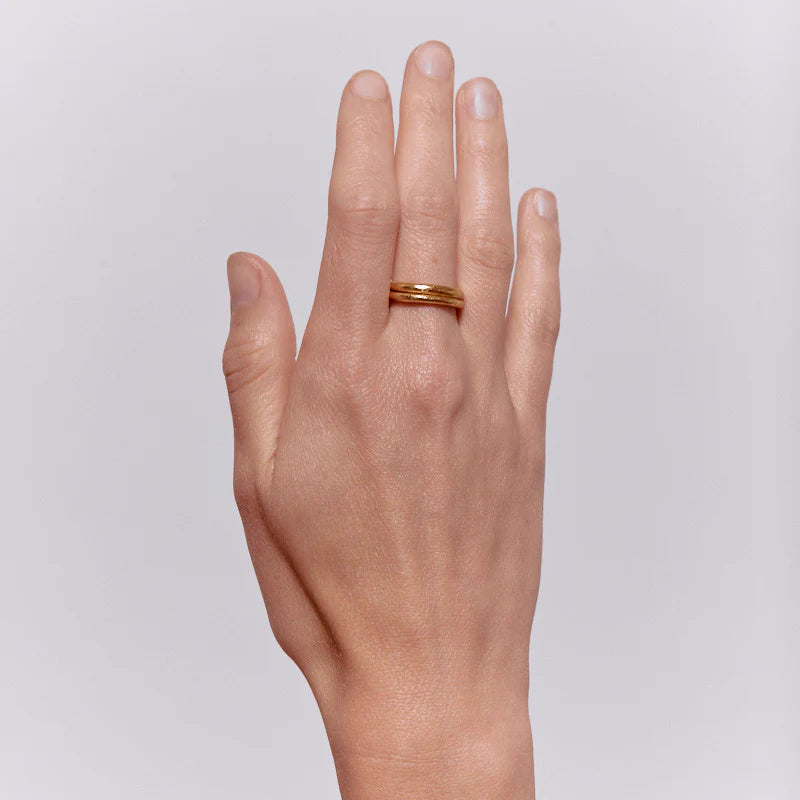 A symbol of unity and potential. This double-banded gold ring features two rounded bands joined together, embodying the harmony of separate elements becoming whole.