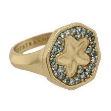 Gold ring with raised octagonal face and debossed star at centre, surrounded by hybrid stones.