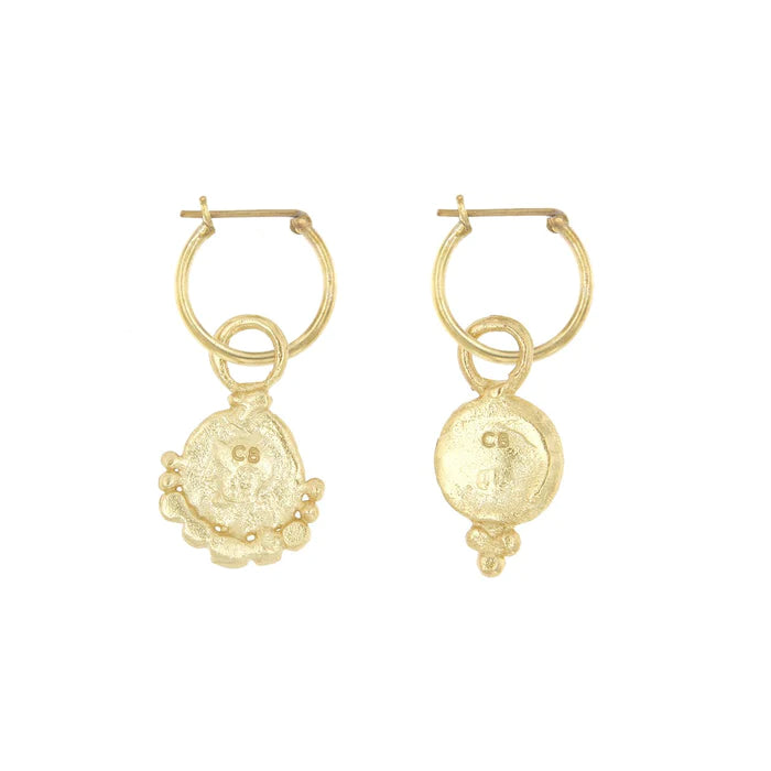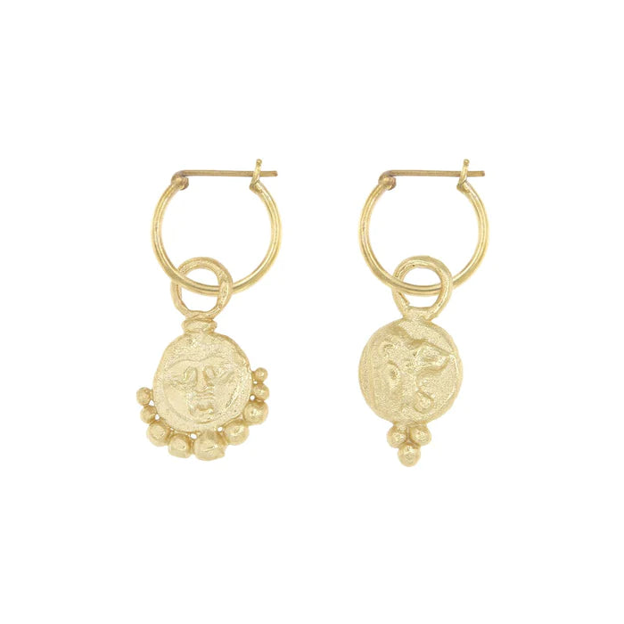 Gold hoop earrings with one Lydia Lion coin charm, and one Gorgoneion charm.