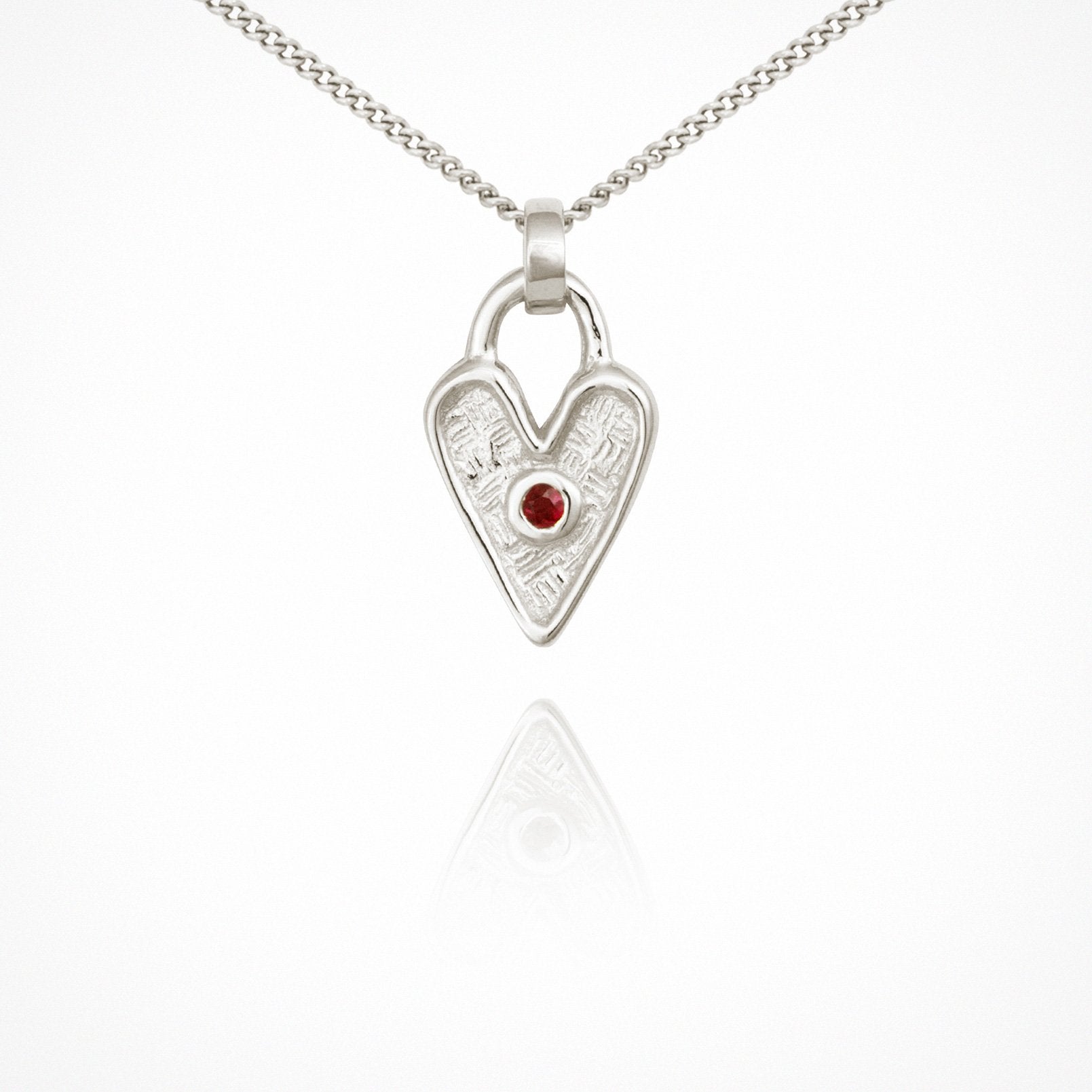 The Amore Necklace in ethical 925 Sterling Silver is a delicate, textural heart pendant representing a padlock, set with a tiny round ruby. Taking its name from the Italian word for 'love', the Amore Necklace is symbolic of all forms of love - for yourself, or another. Ruby’s brilliant red hue speaks to love, sensuality, and confidence. The Amore Necklace is the ultimate expression of everlasting love.