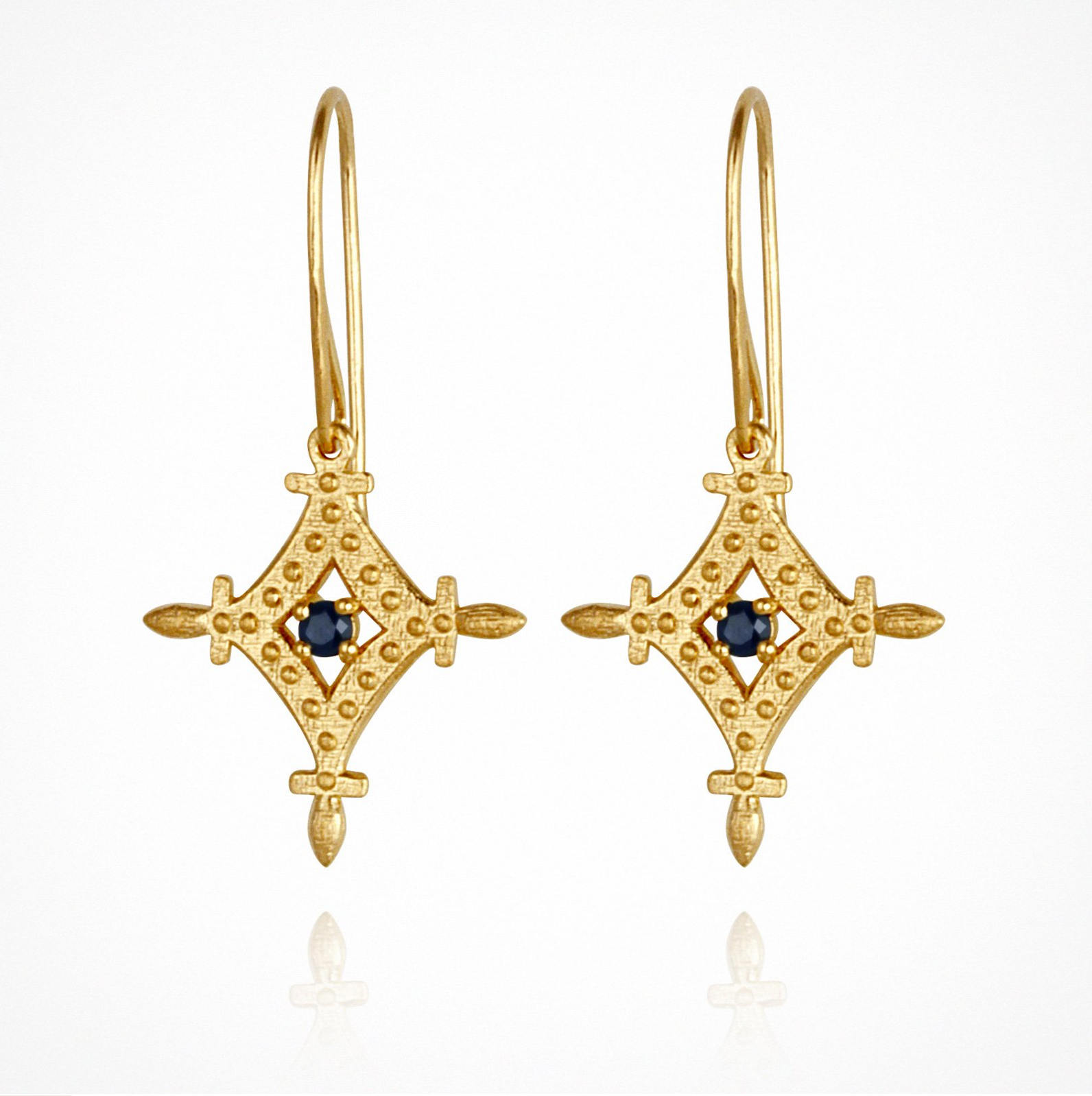 The four points of the Corrin Earrings in cross-brushed 18k Gold Vermeil indicate the four cardinal directions: North, South, East and West. These are intimately tied to the natural elements: earth, air, fire and water. Deepening our connection to nature, we attend and attune to what we truly love within others and ourselves. The holy Blue Sapphire brings us back to our innate wisdom we carry within our hearts.