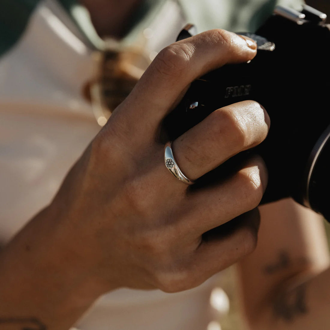Inspired by Stick N' Poke tattoo designs the Flower stacker ring is hand carved in wax and created using the "lost wax method" in sterling silver ring with an oxidised, tumble and hand polish finish.