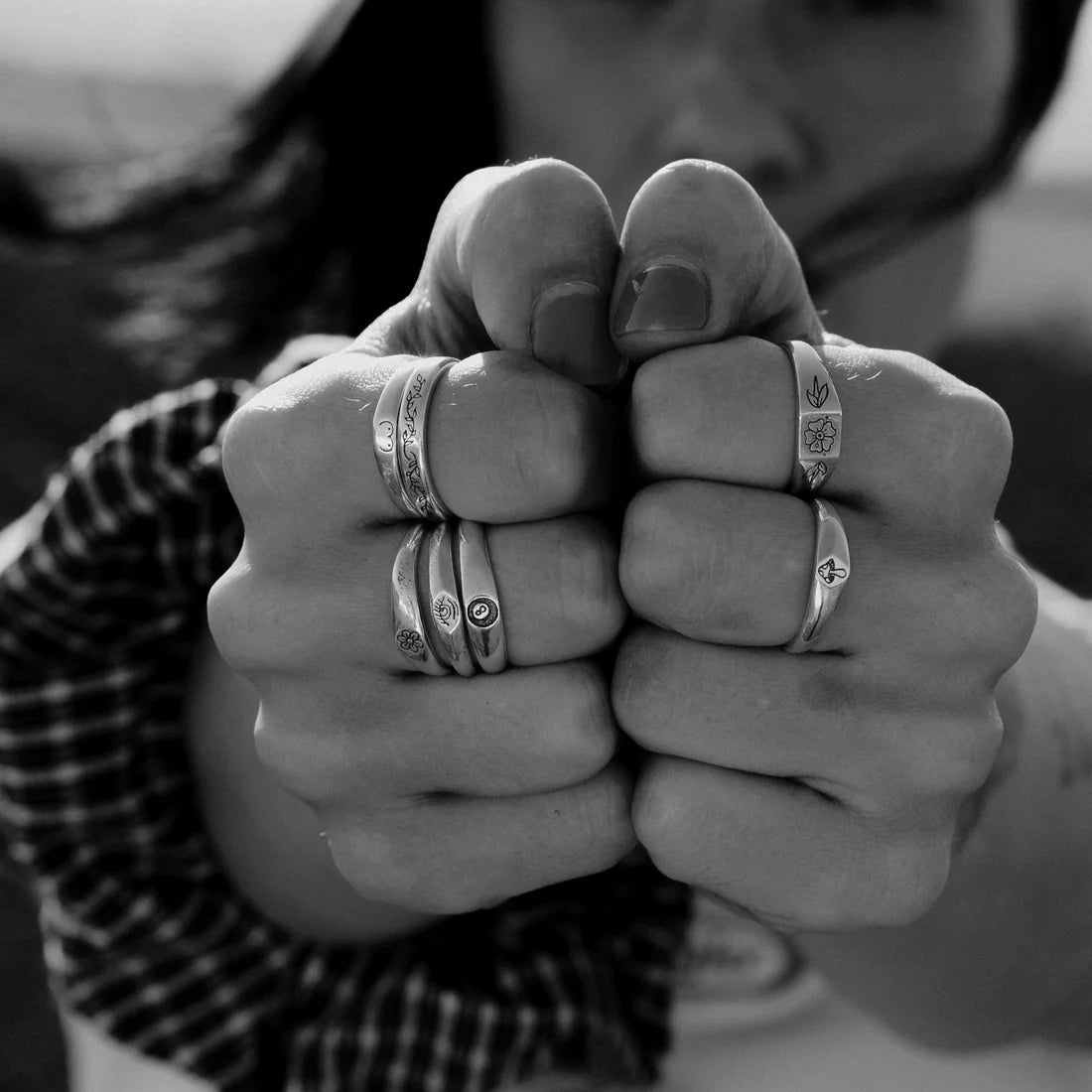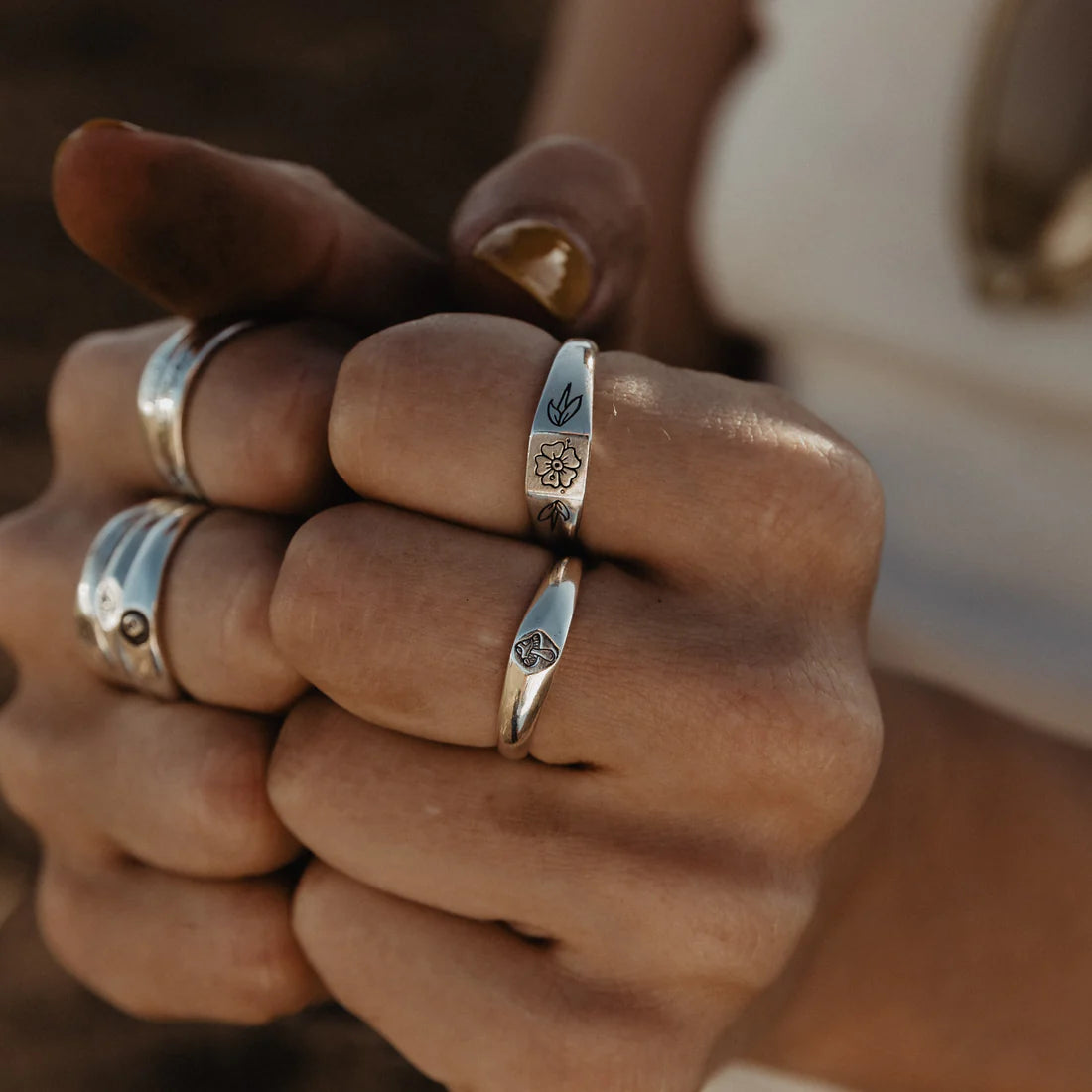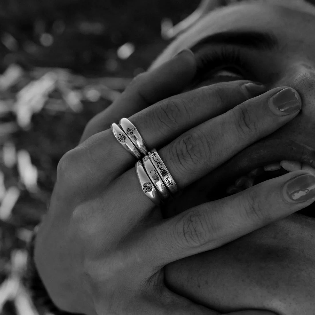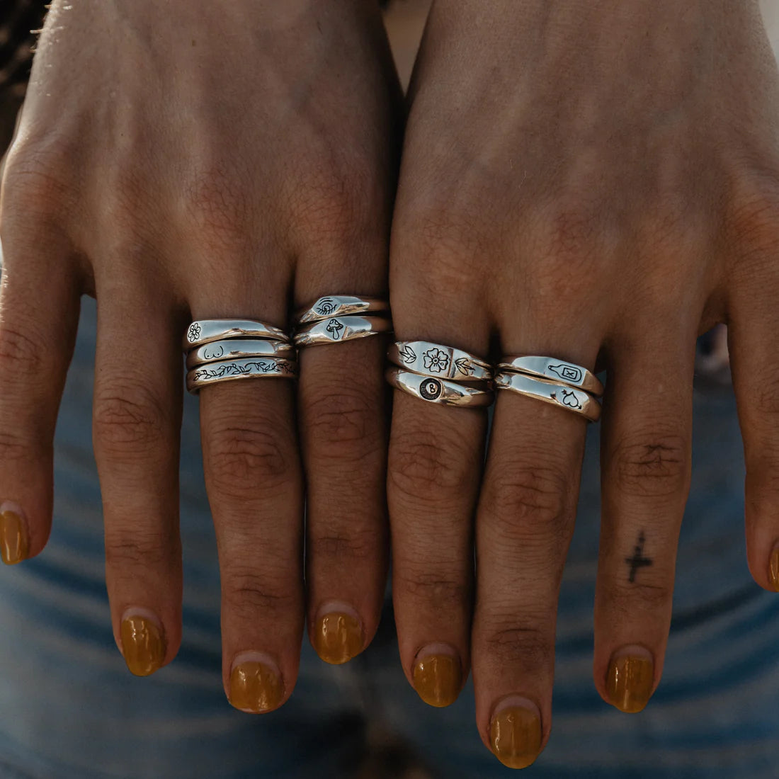 Inspired by Stick N' Poke tattoo designs the Mushy stacker ring is hand carved in wax and created using the "lost wax method" in sterling silver ring with oxidised, tumble and hand polish finish.
