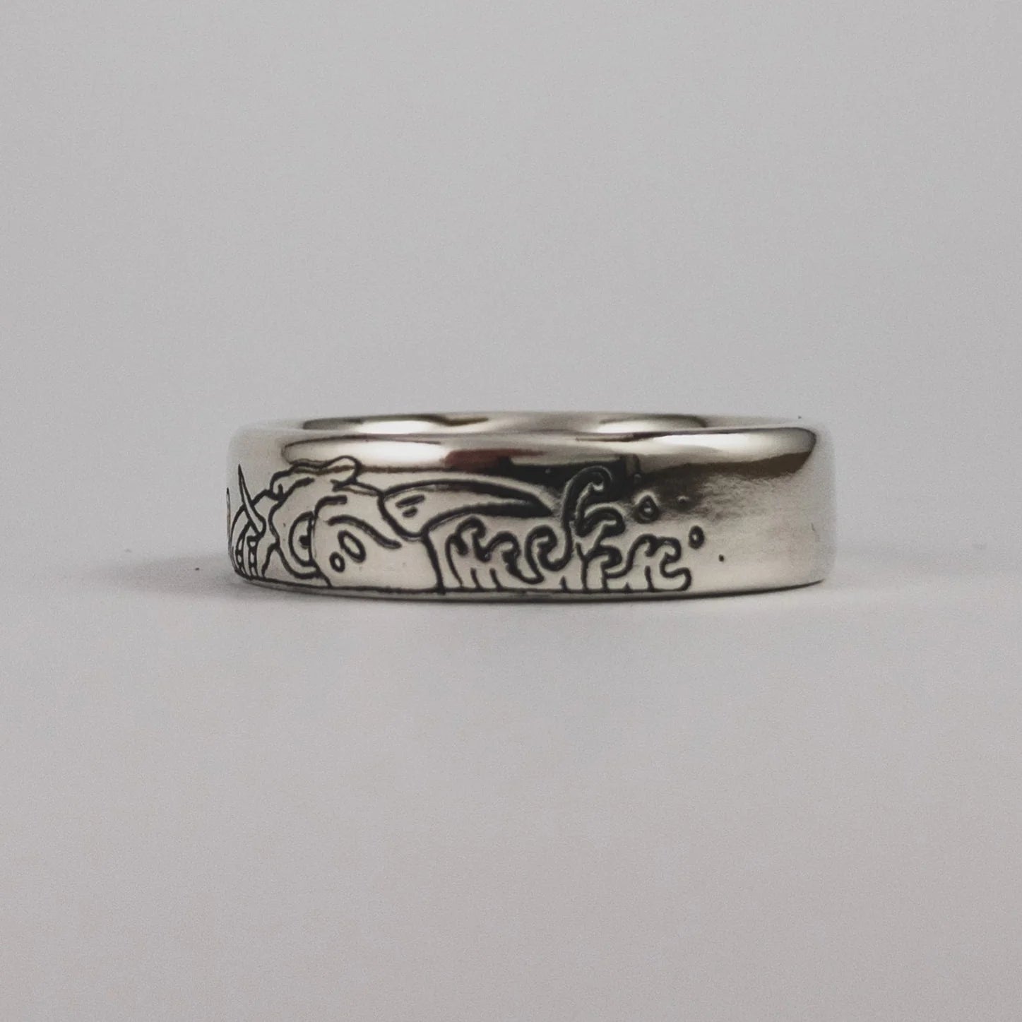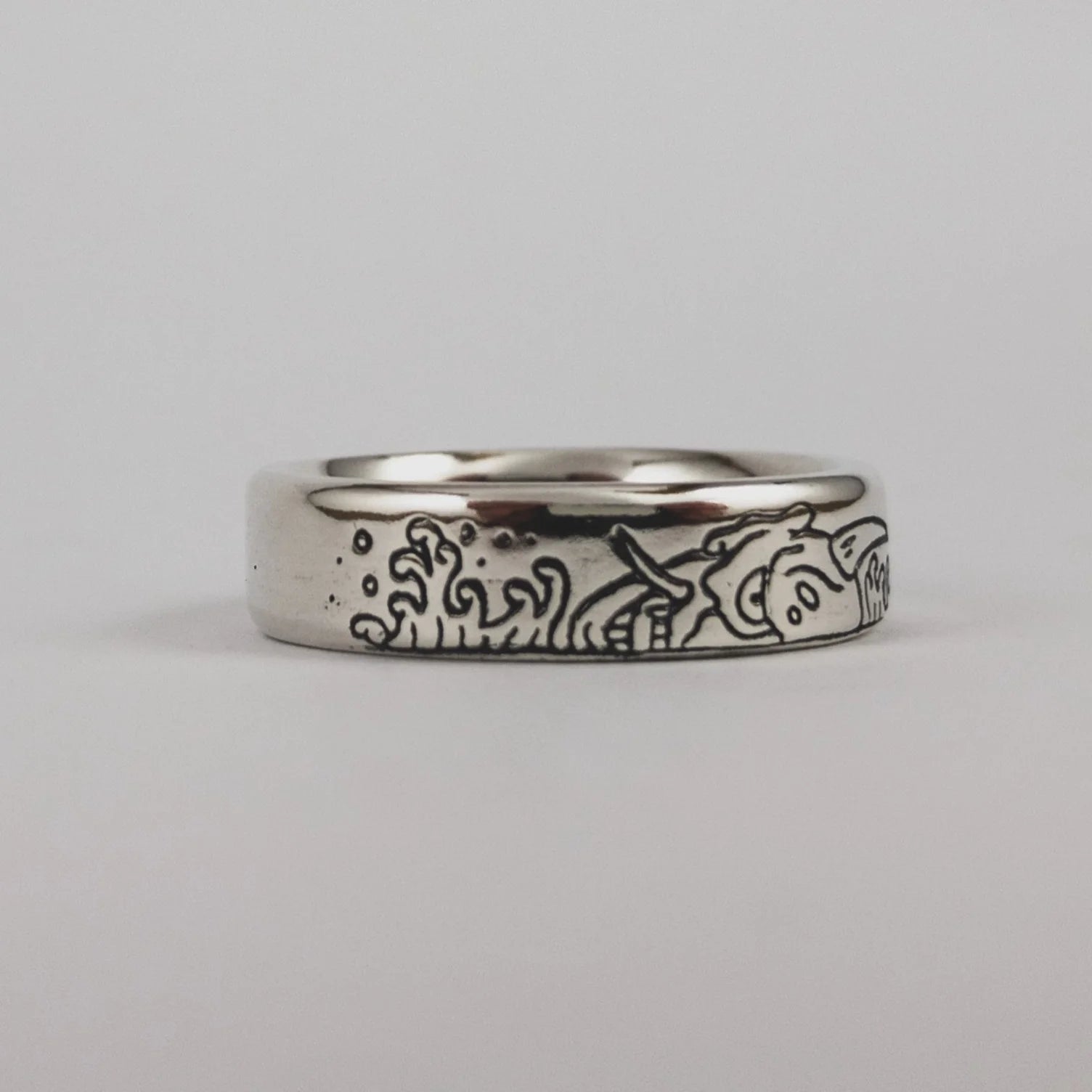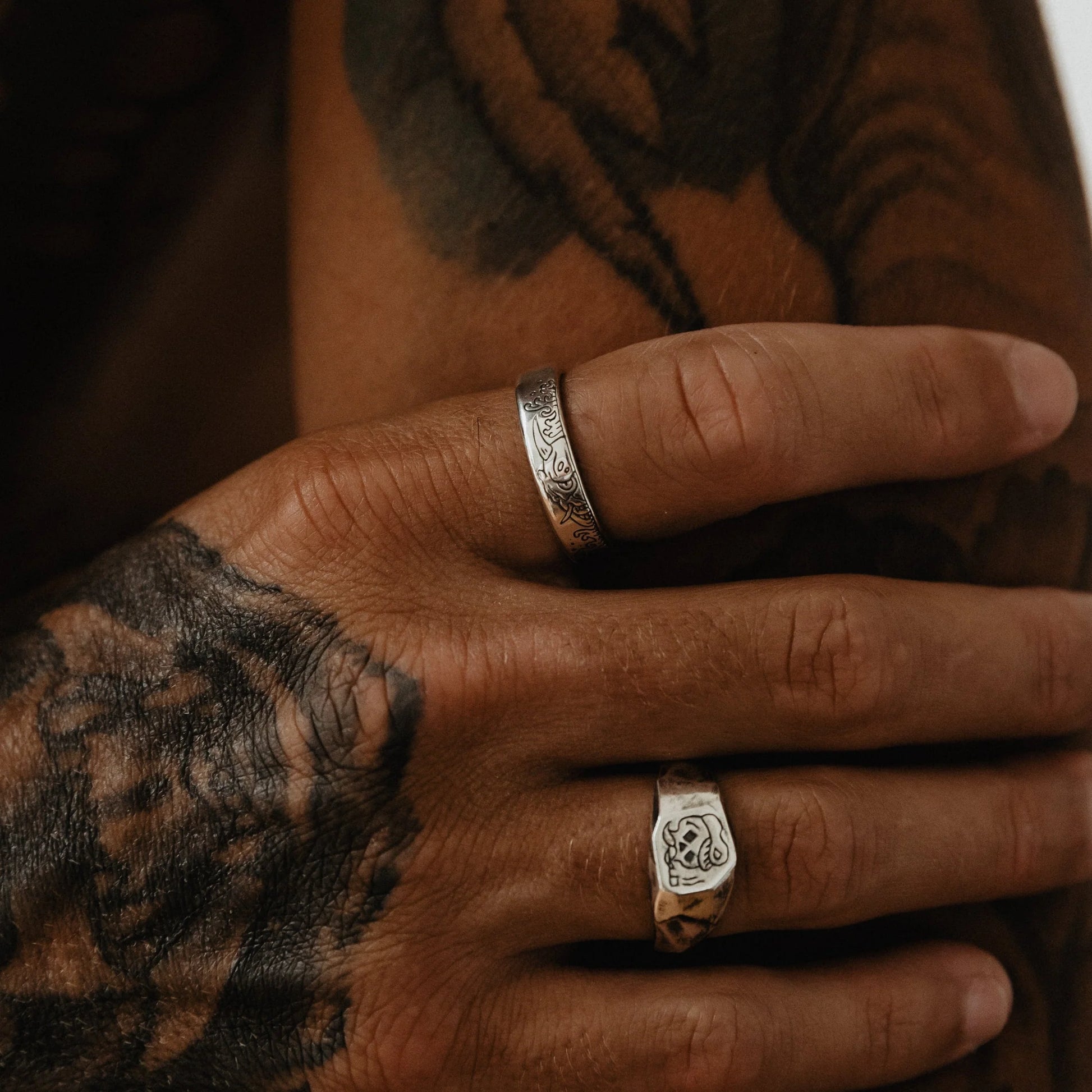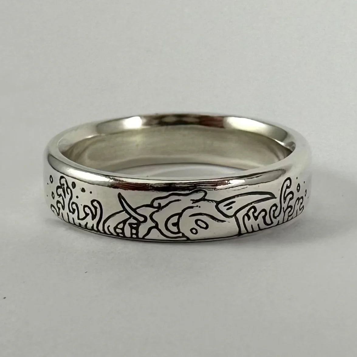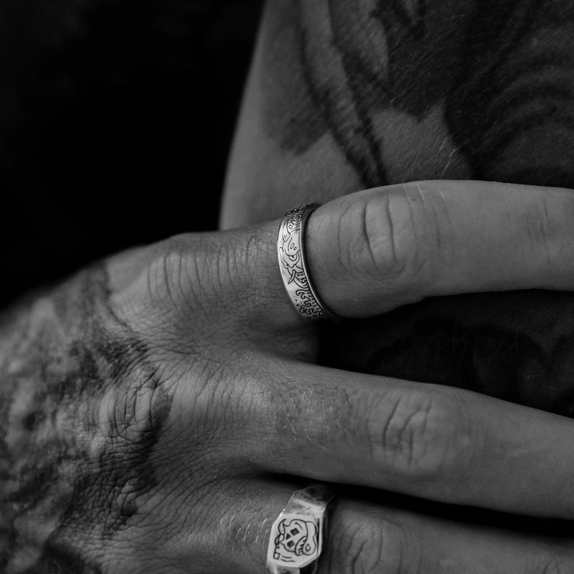 Band design the ring is hand carved in wax and created using the "lost wax method" in sterling silver ring with oxidised, tumble and hand polish finish.