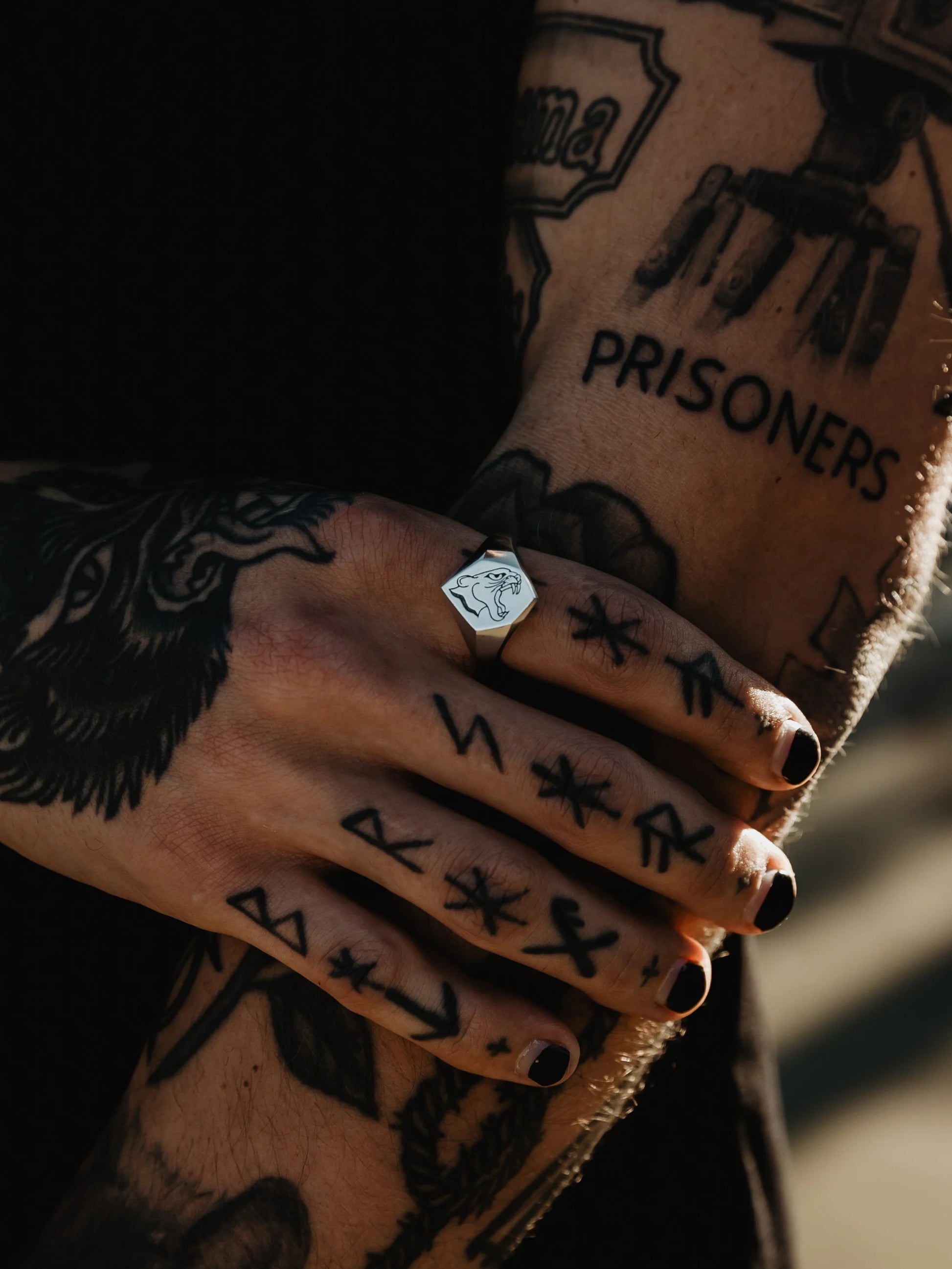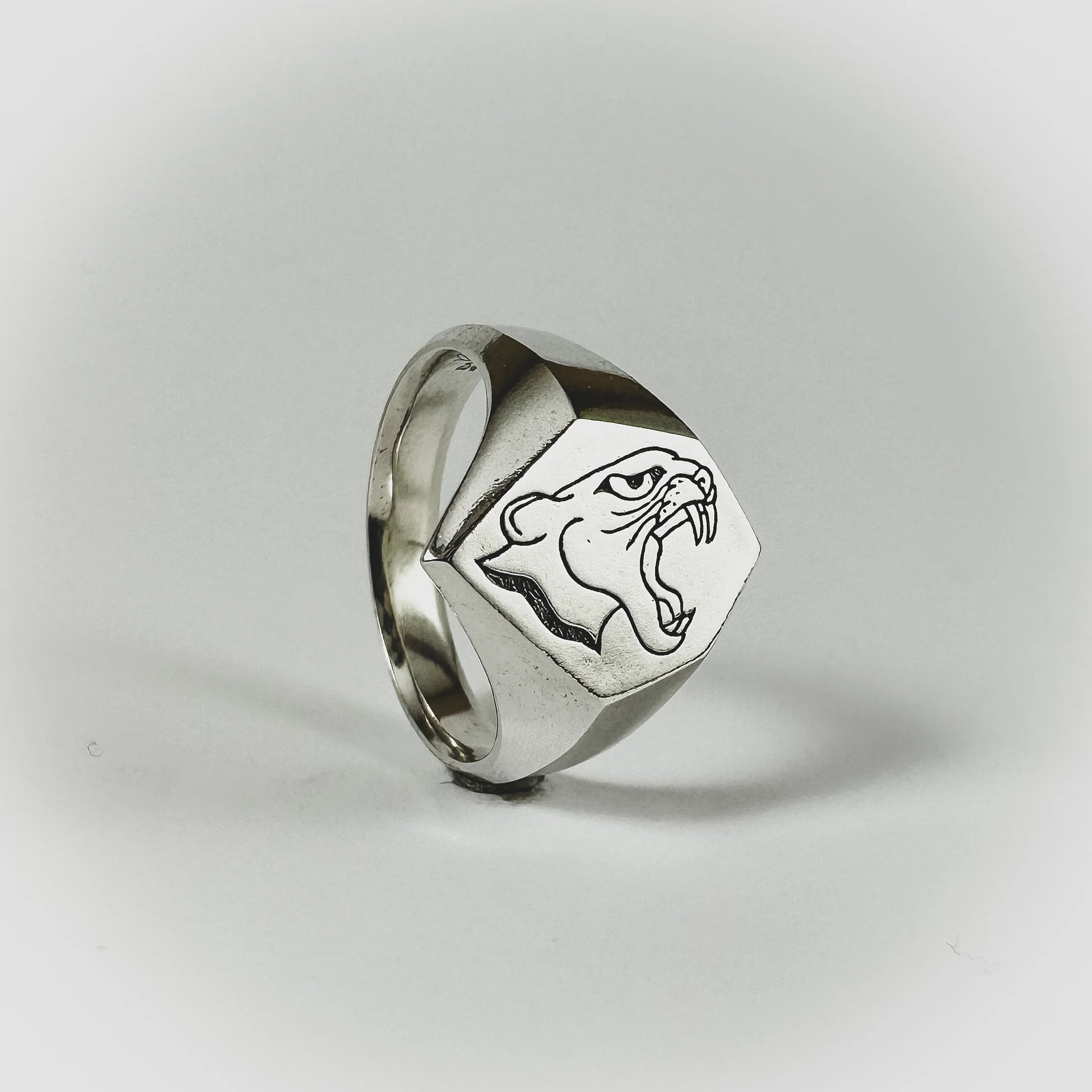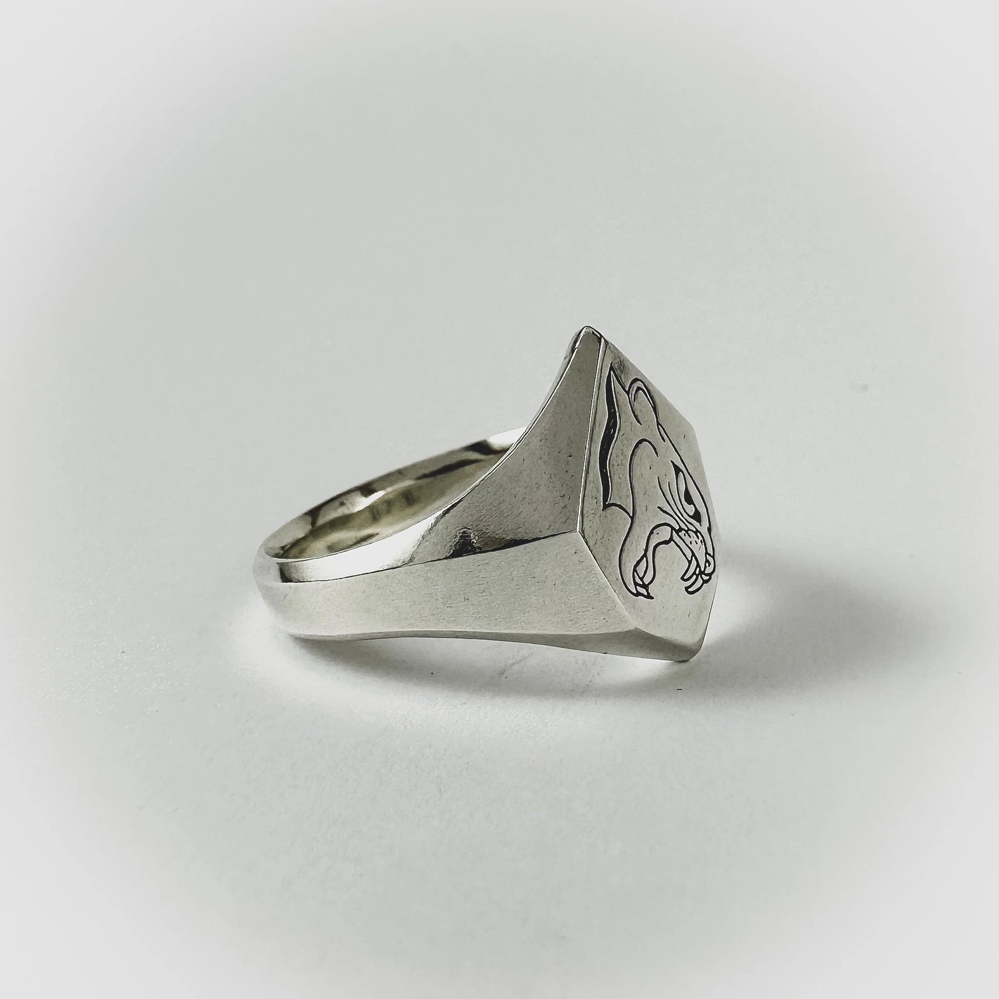 Hand carved and engraved sterling silver ring with oxidised, tumble and hand polish finish.