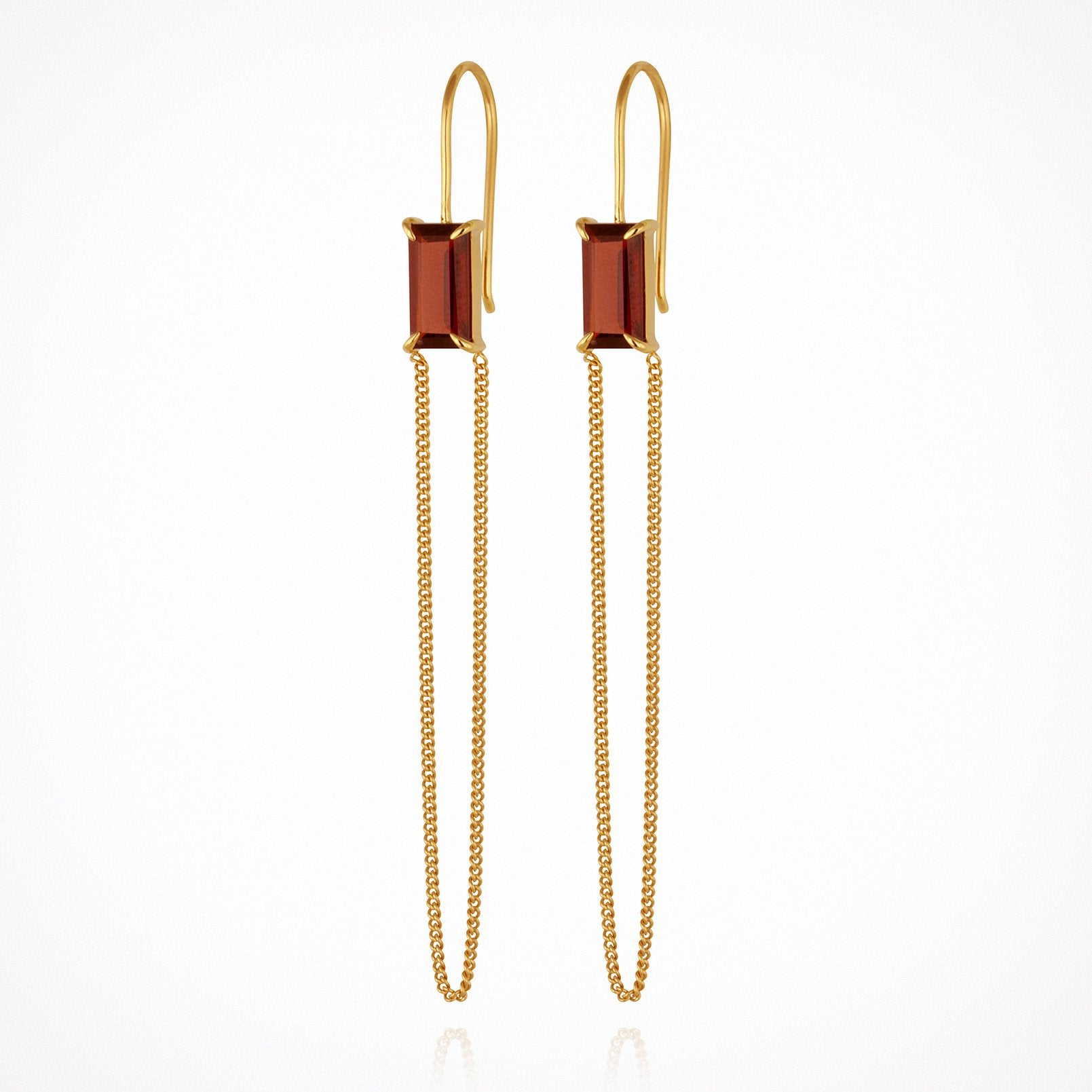 The Ember Earrings in 18K Gold Vermeil are inspired by royal crown jewels. A bold baguette-cut Garnet is held by a modern, minimal setting and contrasted with a delicate suspended curb chain drop. Named after glowing embers, reminiscent of Garnet's red hue; representing passion, creativity and strength. The Ember Earrings are a fiery yet elegant statement.