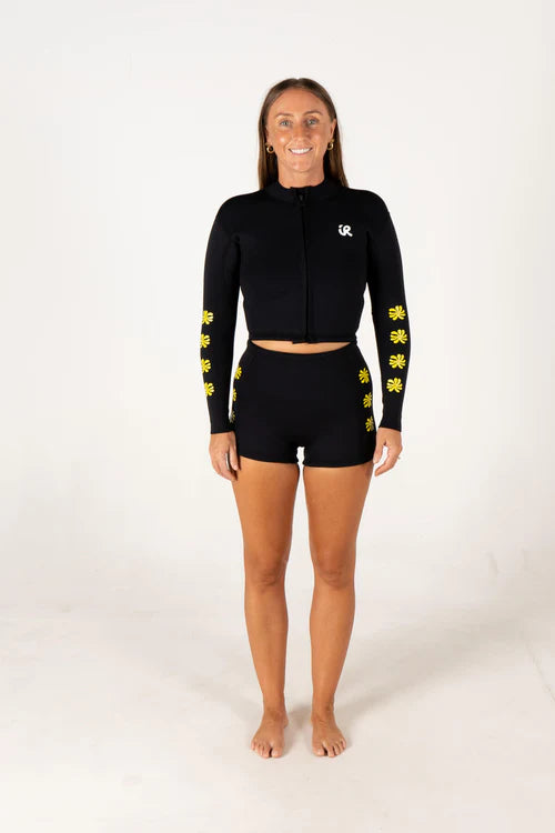 This front zip Black Betty vest is perfect for surfing or any water activity. Throw it over your swimwear, with the shorts or over top of a long jane for added warmth. Crafted with limestone rubber, it is lightweight and flexible with 2mm flatlock stitched seams. Featuring groovy flower artwork adds to the unique Inner Relm style.