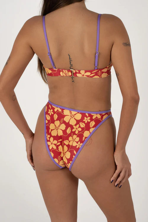 The Good Luck Bikini bottoms have a groovy high waisted cut with vintage contrasting trim to match. These flattering bottoms will have you looking and feeling like the superwoman that you are! Inspired by tropical holidays and long days at them beach. The Good Luck bra cup bikini top with groovy tropical flower pattern and vintage style contrasting trim. Hold everything in and look good while at it! Designed to be flattering and supportive for the bust. Get Groovy in the water with this spicy little throwback to the old school.
