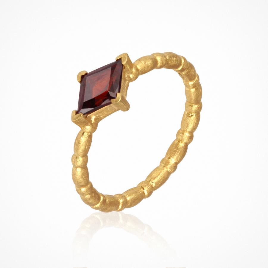 On a band of cross brushed 18K Gold Vermeil, our kite cut Garnet stands out with its earthy and subtle aesthetic. Its rich lustre and unique vibrations give us the strength to move in the direction of progress to reach a higher state of consciousness. Just like the proverb says, “Feet on earth, head to heaven,’ repeat these words of ancient wisdom when you incorporate the Garnet crystal stone meaning into your daily rituals.