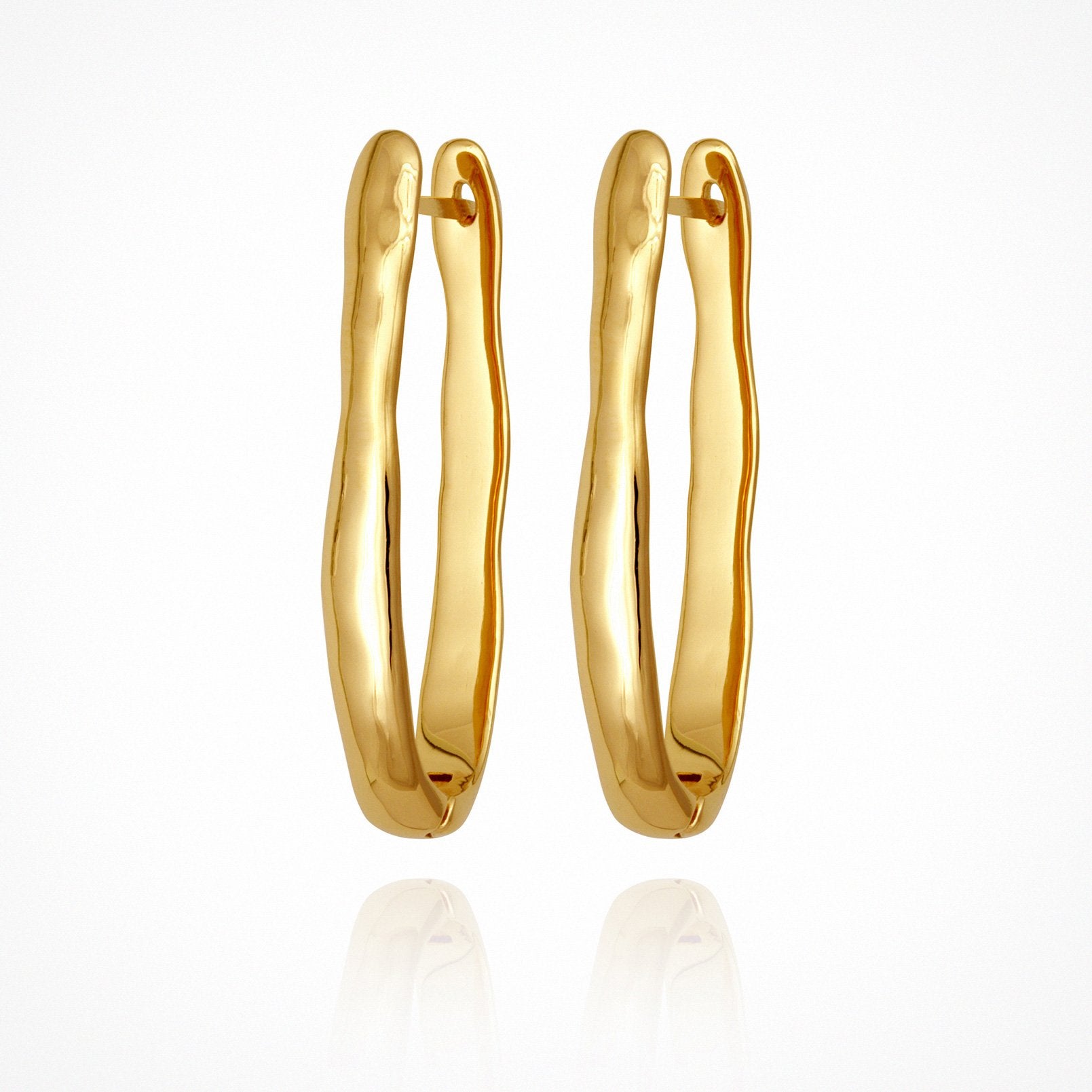 The Kaolin Earrings in 18K Gold Vermeil are a long, oval hoop earring with a lever closure to hug the ear. Named after Kaolin, the soft clay used to make fine china and a nourishing ingredient in skincare; the raw organic lines are reminiscent of hand formed pottery, beautifully contrasted with a highly polished finish and a distinctly modern ancient feel.