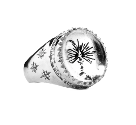 I designed it so the cabochon (rounded top) shape of the Quartz acts like a lens, turning the engraving into an illusion, morphing, magnifying, and shifting from all perspectives. Held in place by a jagged, crown-shaped bezel setting, it's a royal looking piece.