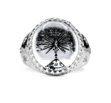 Engraved stars of White Sapphire scatter across the band, tying it to something both cosmic and sacred. A ring that feels alive, like carrying a small optical illusion on your hand.