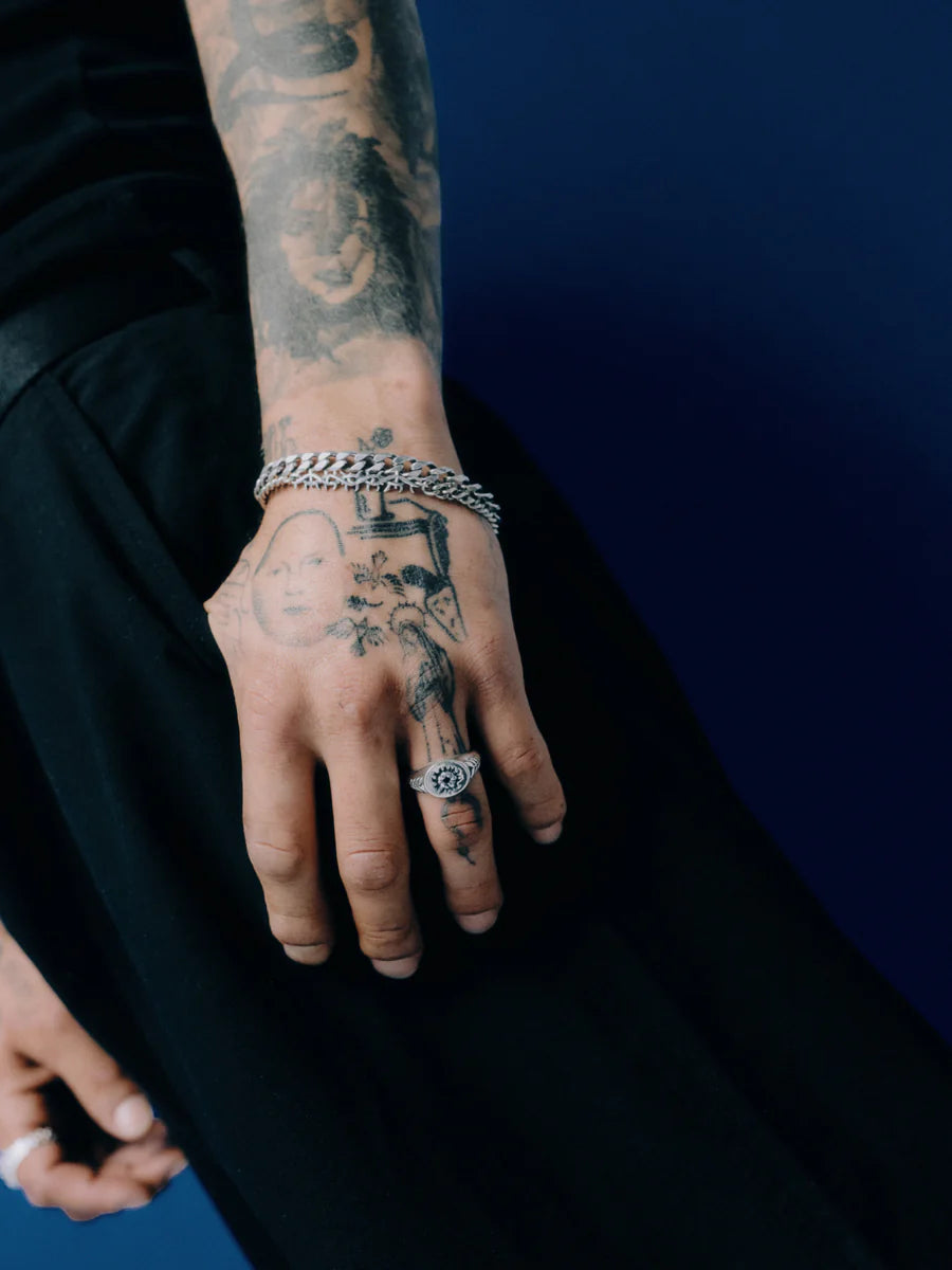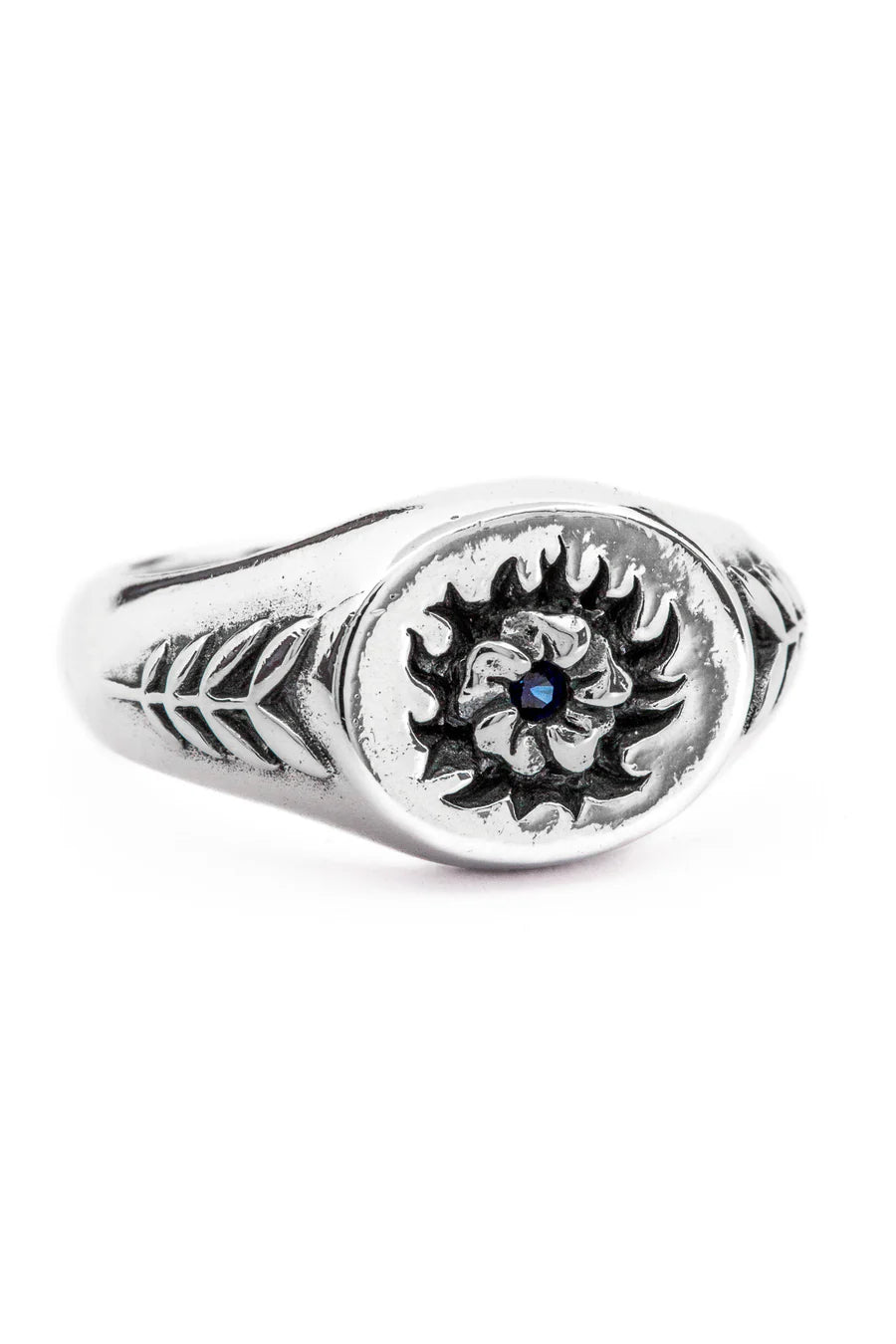 A blue sapphire sits seamlessly on the face of this flaming violet signet.