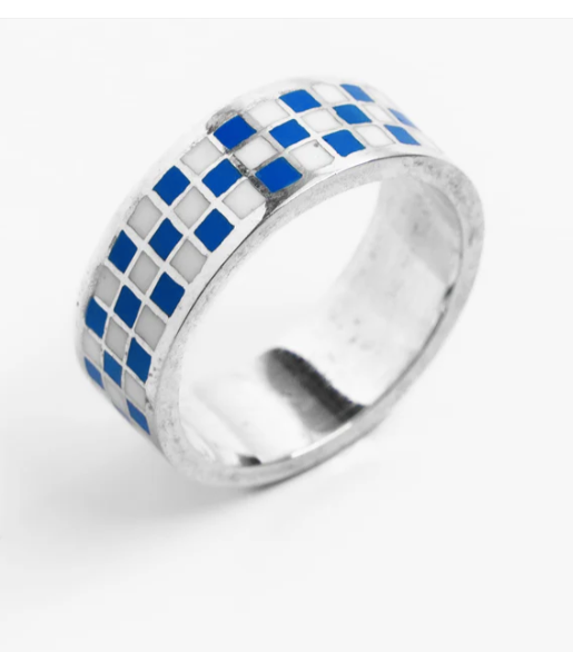A checkered face combines recycled 925 sterling silver and royal blue enamel, creating a stylised, sequential swatch.