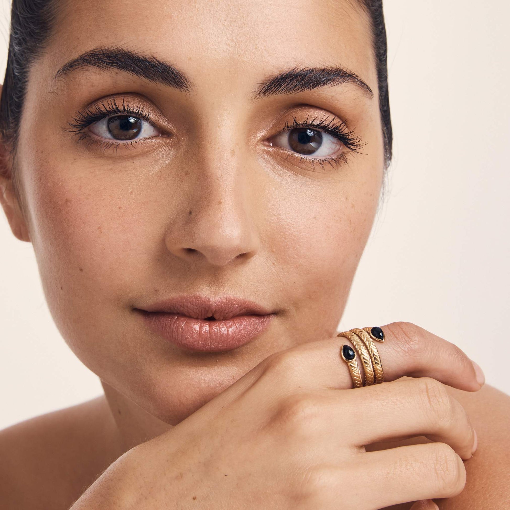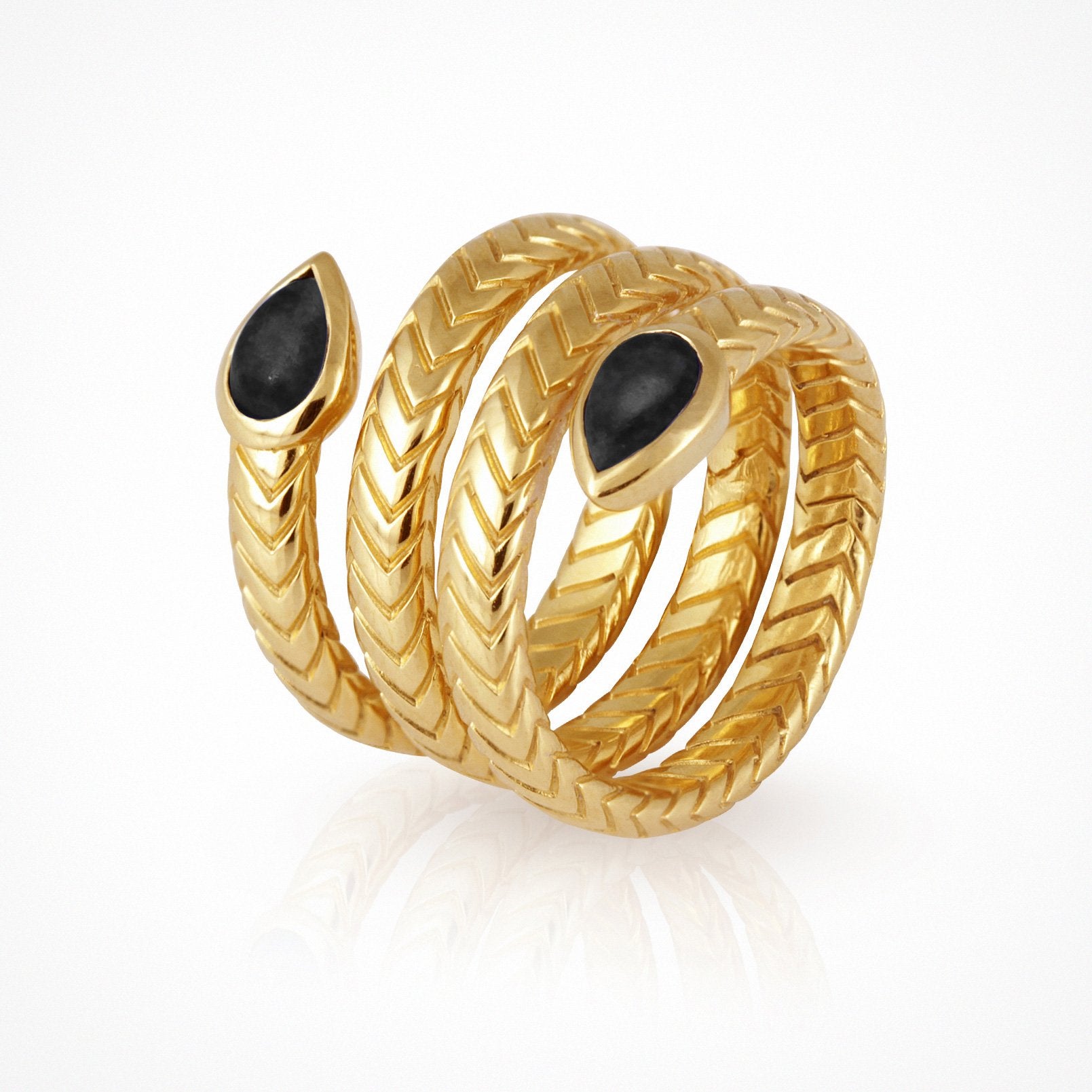 The serpent is one of the oldest and most widespread mythological symbols and has been associated with some of the oldest rituals known to mankind as it represents dual expression of good and evil. Our contemporary Metis Ring, in polished 18K Gold Vermeil, with two black Onyx gemstones, that inspires feelings of personal power when facing your fears.