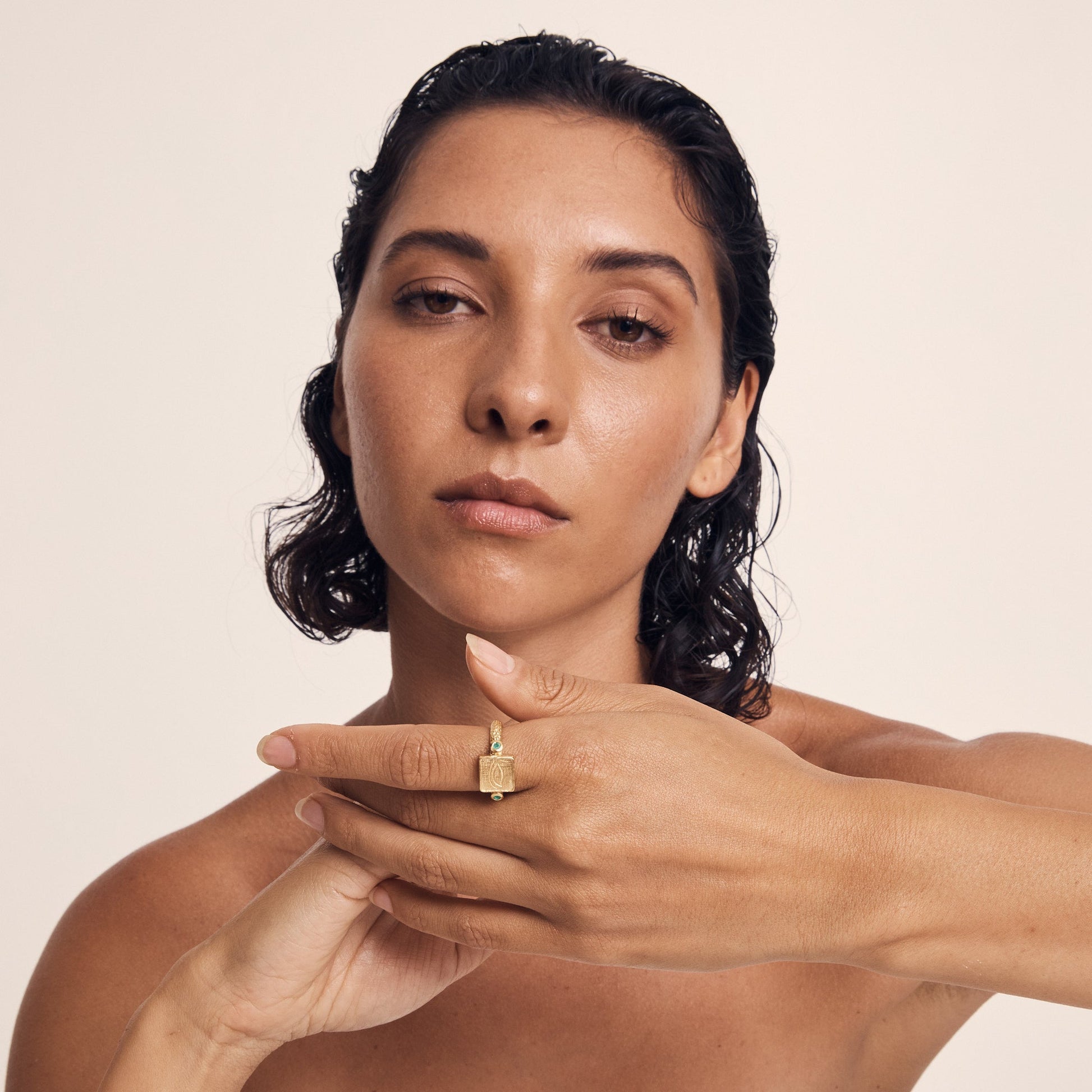 The Osiris Seal Ring in 18K Gold Vermeil is a cross brushed seal ring featuring an engraved Eye of Horus, flanked by two emeralds on a textured band. Named after Osiris, an Egyptian God and father of Horus, to whom green was a sacred colour. According to mythology, the Eye of Horus was gifted to Osiris by Horus to revive him; becoming a symbol of wellbeing, healing and protection. The brilliant round emeralds speak to love, compassion, and healing. The Osiris Seal Ring Gold represents transformation, protecting us on our journey of rebirth as we enter new stages of our lives.