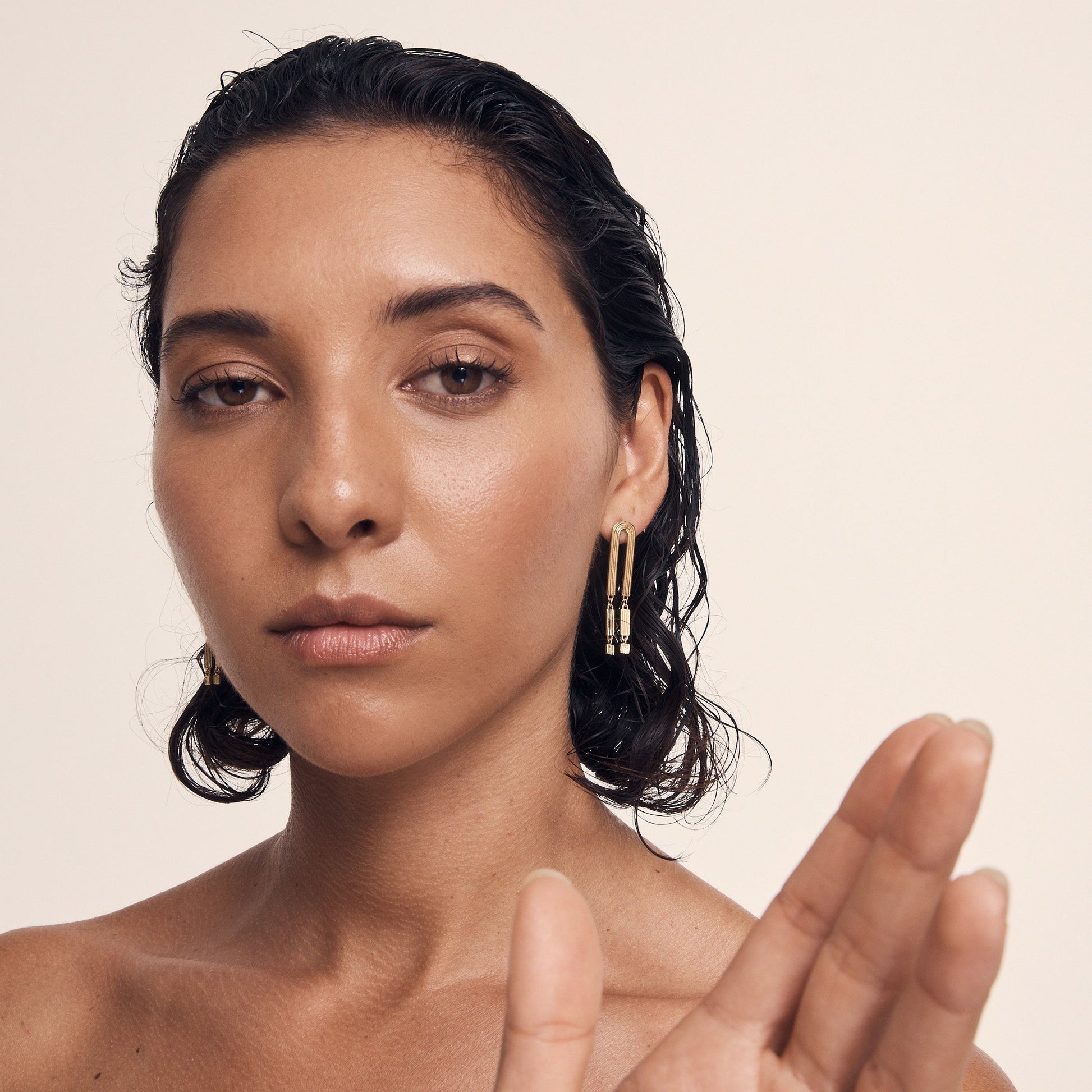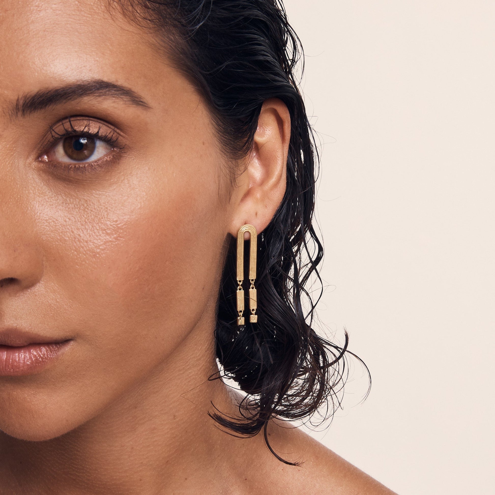 The Renata Arch Earrings in ethical 925 Sterling Silver are a statement stud earring with a symmetrical etched drop. The ancients considered the act of passing through an arch to be symbolic of rebirth. Named from the Latin word for reborn, the Renata Arch Earrings speak to the possibility of new beginnings.