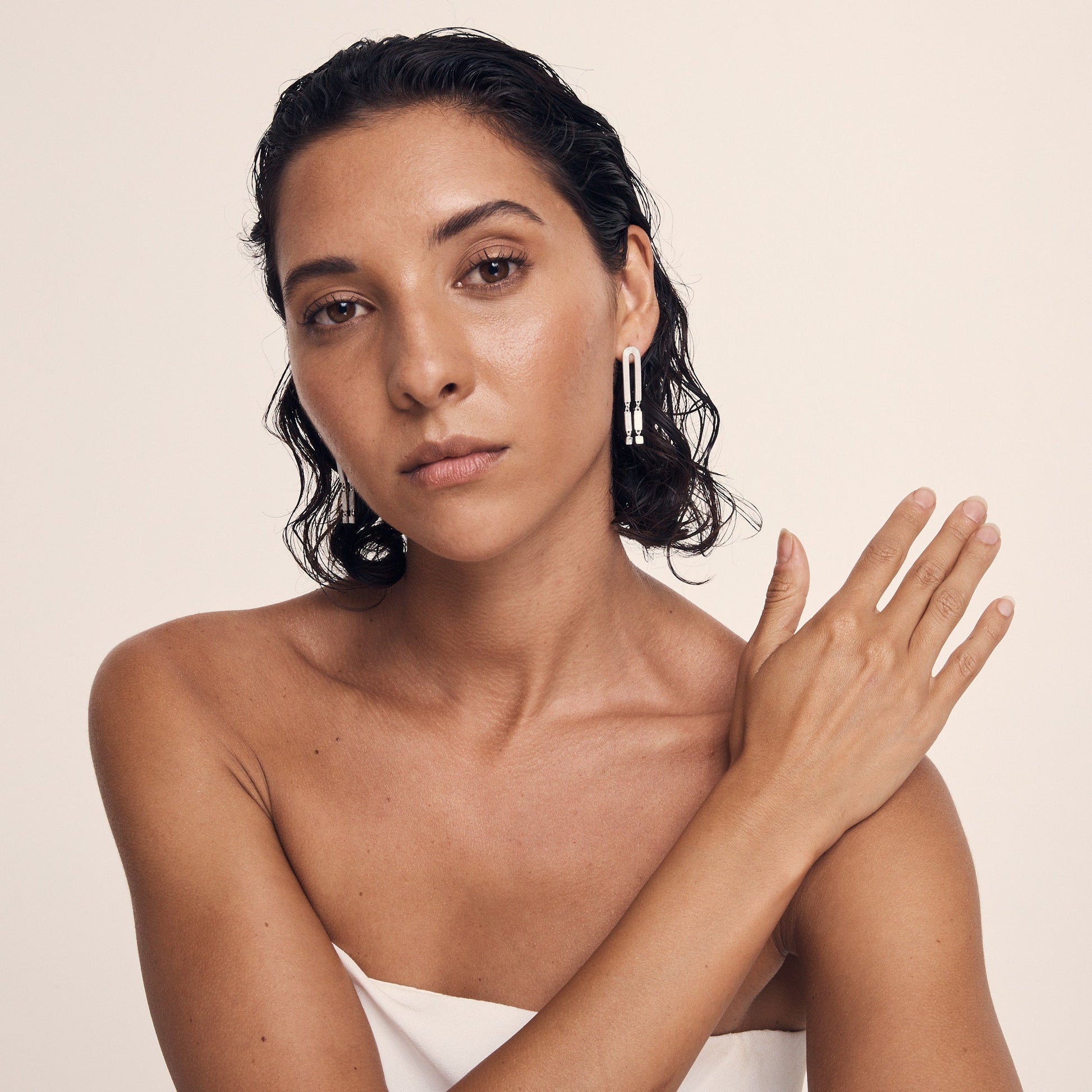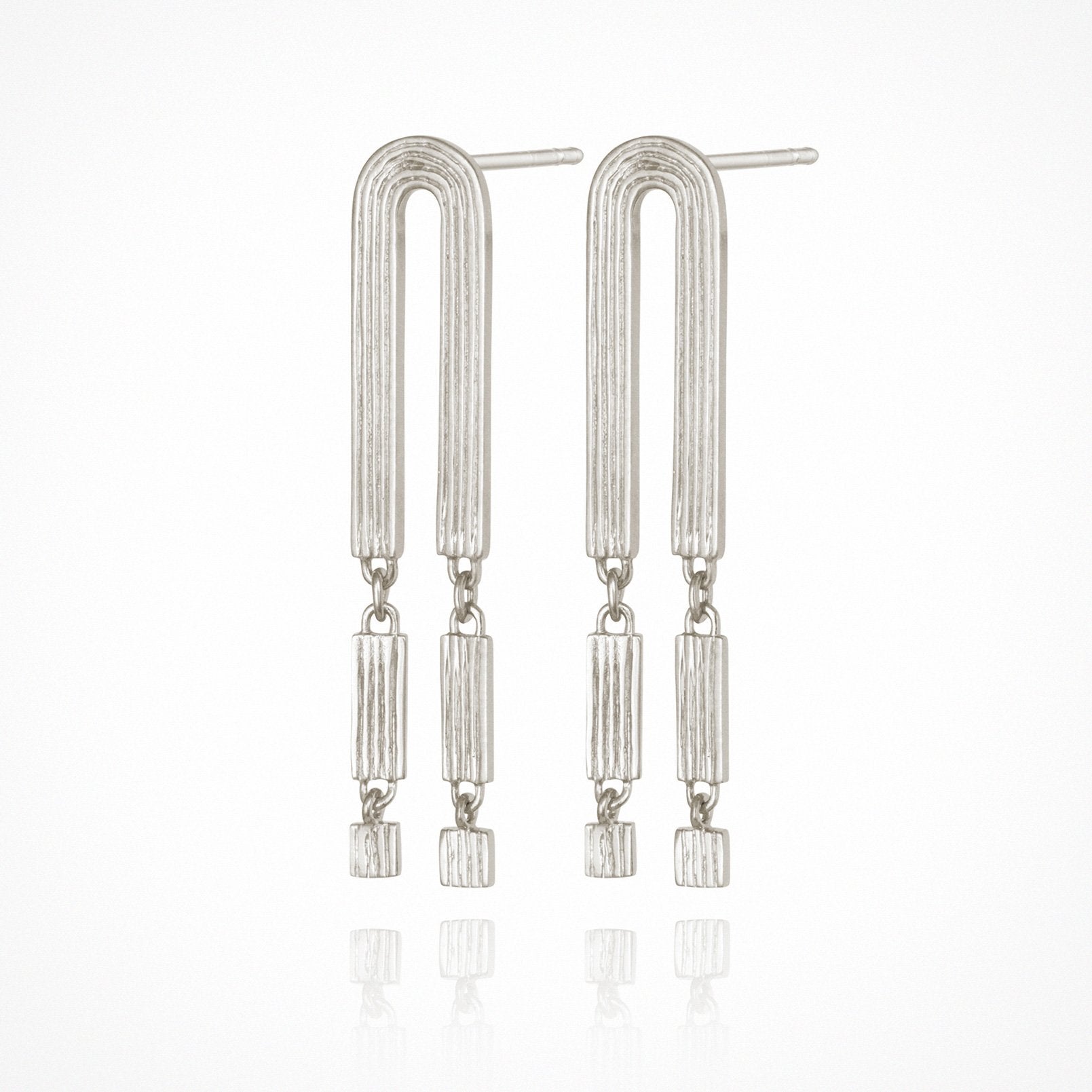 The Renata Arch Earrings in ethical 925 Sterling Silver are a statement stud earring with a symmetrical etched drop. The ancients considered the act of passing through an arch to be symbolic of rebirth. Named from the Latin word for reborn, the Renata Arch Earrings speak to the possibility of new beginnings.