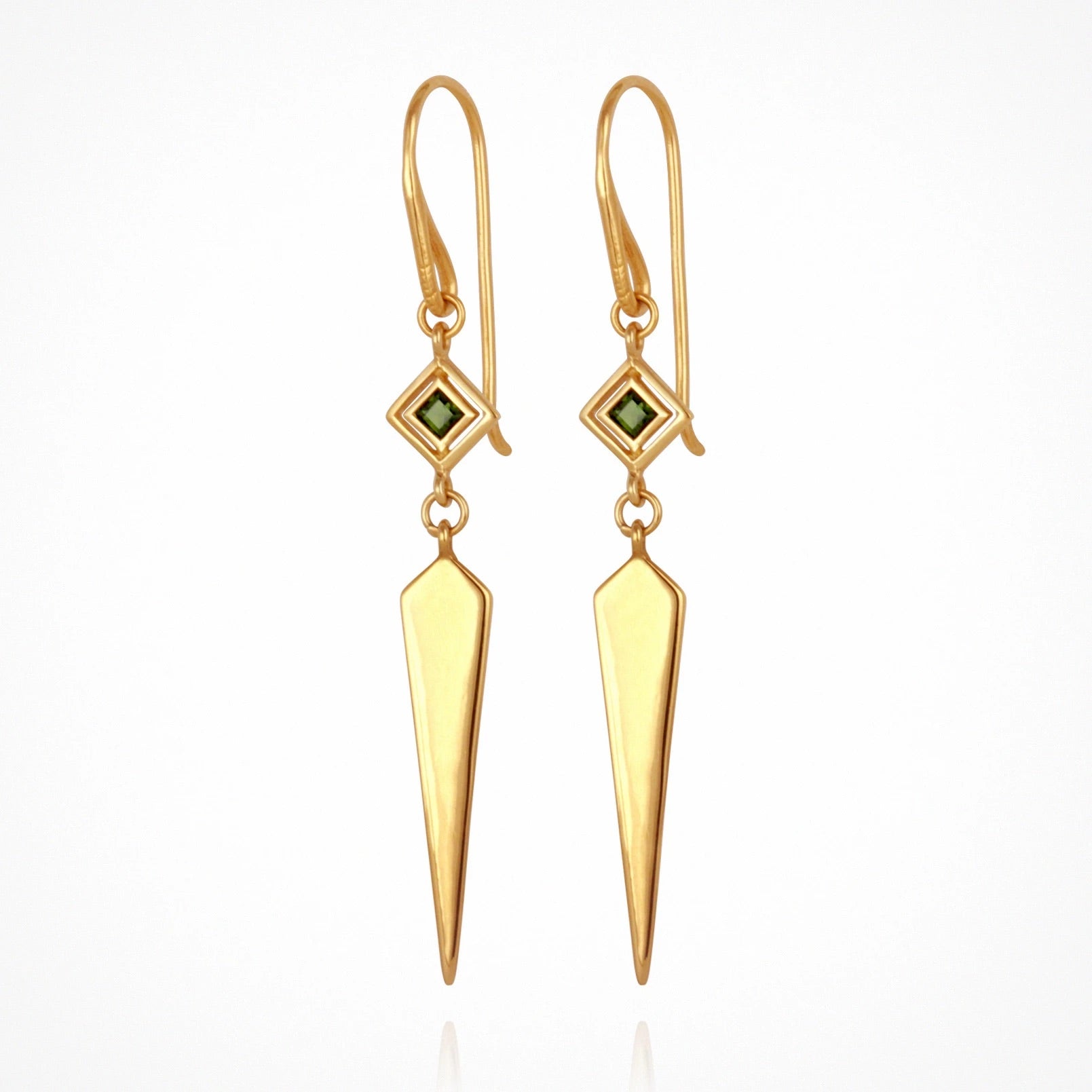 The Rhya Earrings, in 18k Polished Gold Vermeil, are as delicate as they are powerful in their form. Featuring fine hand-made pendants suspended below a stunning square-cut Green Tourmaline, a gemstone known for its powerful heart-healing qualities.