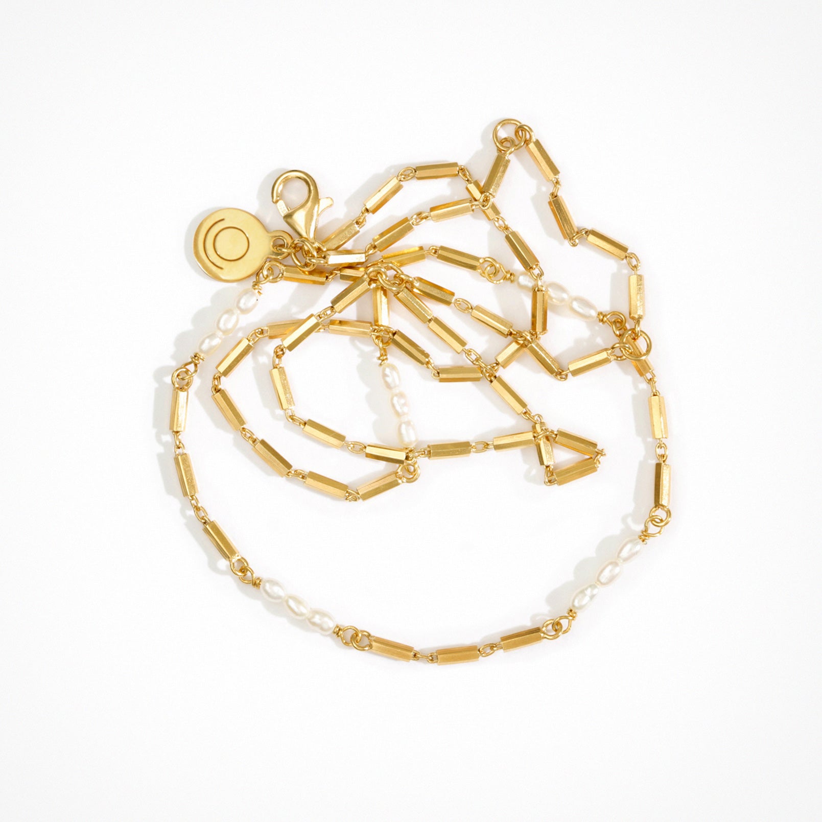 The Riviera Necklace Pearl in 18K Gold Vermeil is a delicate cane cable chain with five groups of freshwater white pearl beads. The fluid movement of the necklace around the neck is reminiscent of the white capped waves and terraced cliff faces of the Italian Riviera. Pearls are thought to calm their wearer, representing affection and loyalty. The Riviera Necklace Pearl carries the essence of the waves calming rhythm.