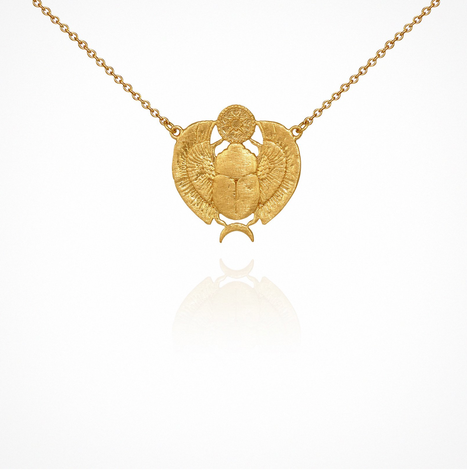 The Scarab necklace is a hand brushed 18k ethical gold vermeil necklace inspired by the ancient Egyptian symbol of the Scarab Beetle. Worn as a protective talisman by both the living and the deceased it was one of the most potent of all amulets, symbolising the sun, protection, transformation and rebirth.