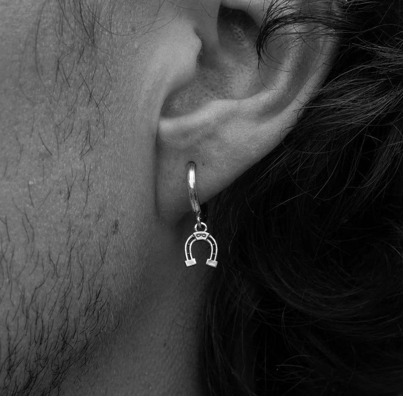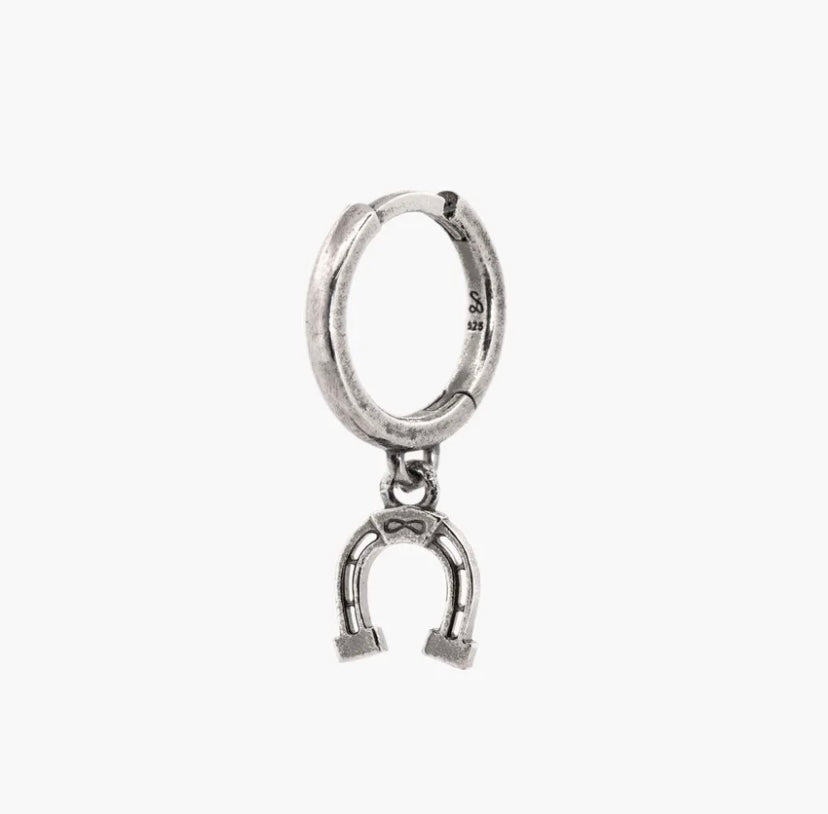 The Bullseye Huggie Earring features a 7mm x7mm horseshoe charm on a 10mm huggie earring, cast in 925 sterling silver.