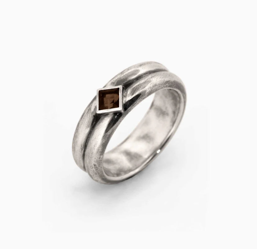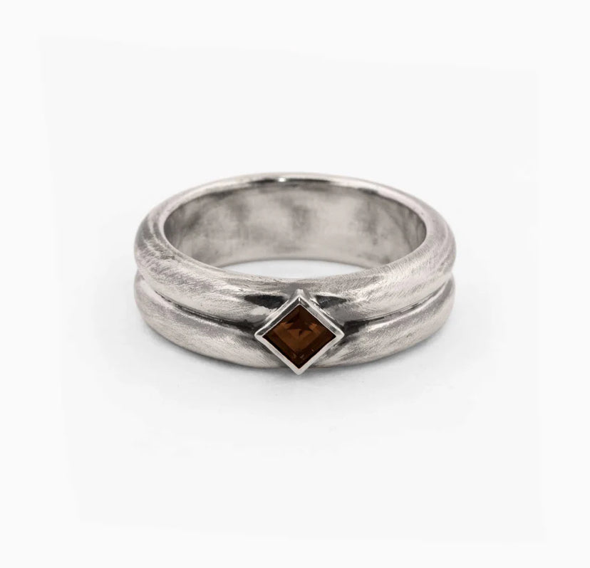 The Double On The Rocks Band Ring features a 7.2mm wide double band set with a 4mm square cut smoky quartz gemstone, cast in 925 sterling silver.