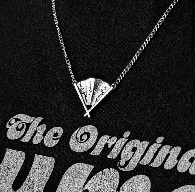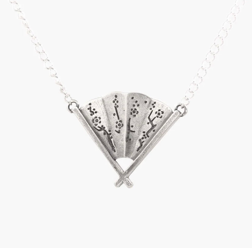 The Hand Fan Pendant features a 3cm x 2.2cm hand fan pendant with an engraved cherry blossom on a long cub chain, cast in 925 sterling silver.