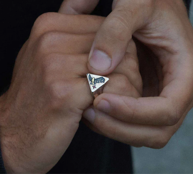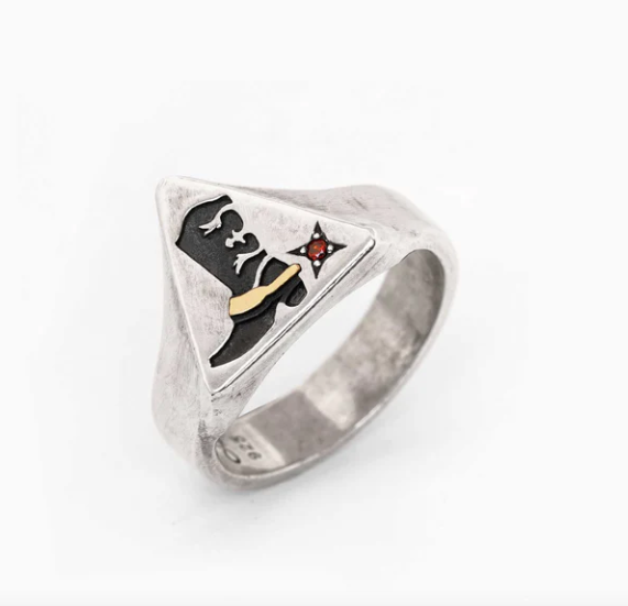 The Howdy Signet Ring features a 14.4mm x 15.3mm triangle face set with a brass buckle and 1.5mm garnet gemstone spur, cast in 925 sterling silver.