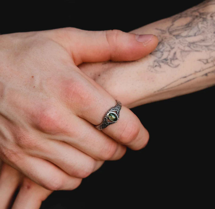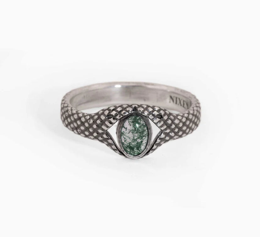 In Collaboration with skating legend Nixen Osborne, we have designed the Snake Run Ring featuring a 4mm wide band forming two snake heads biting a 7mm x 5mm moss agate gemstone, cast in 925 sterling silver.