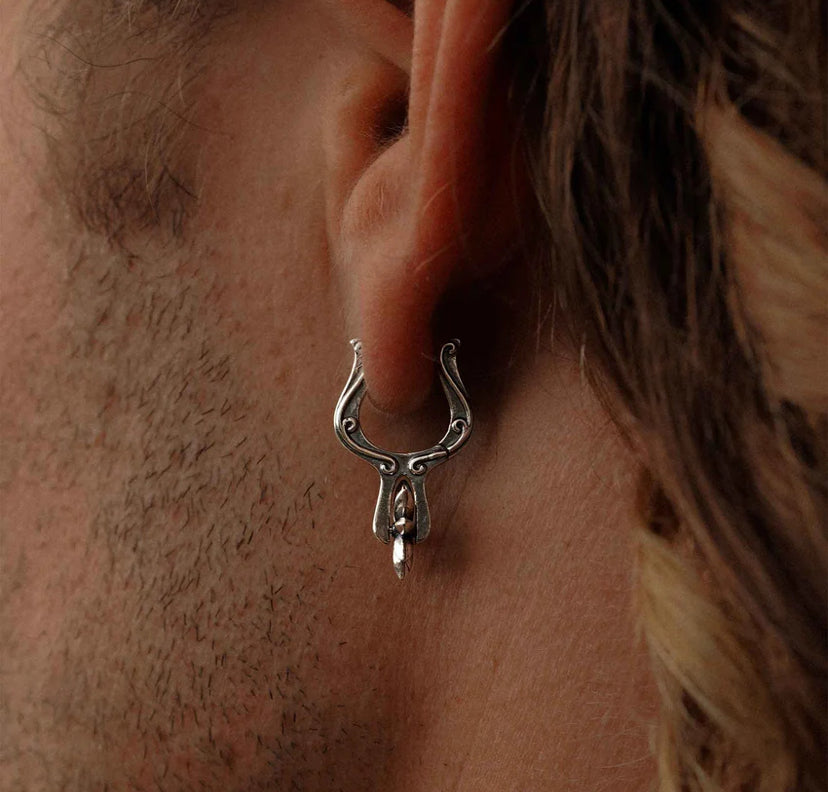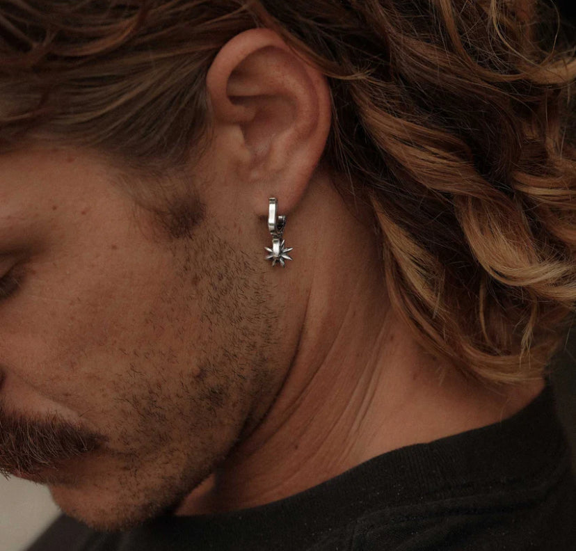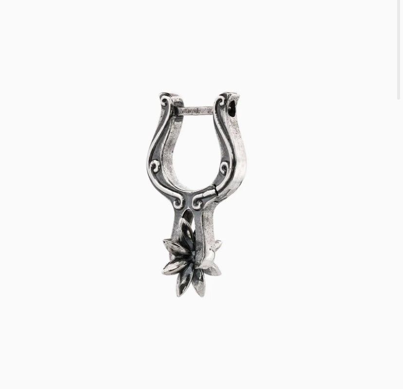The Spur Huggie Earring features a 12mm boot buckle huggie with a 9mm rotating spur charm, cast in 925 sterling silver.
