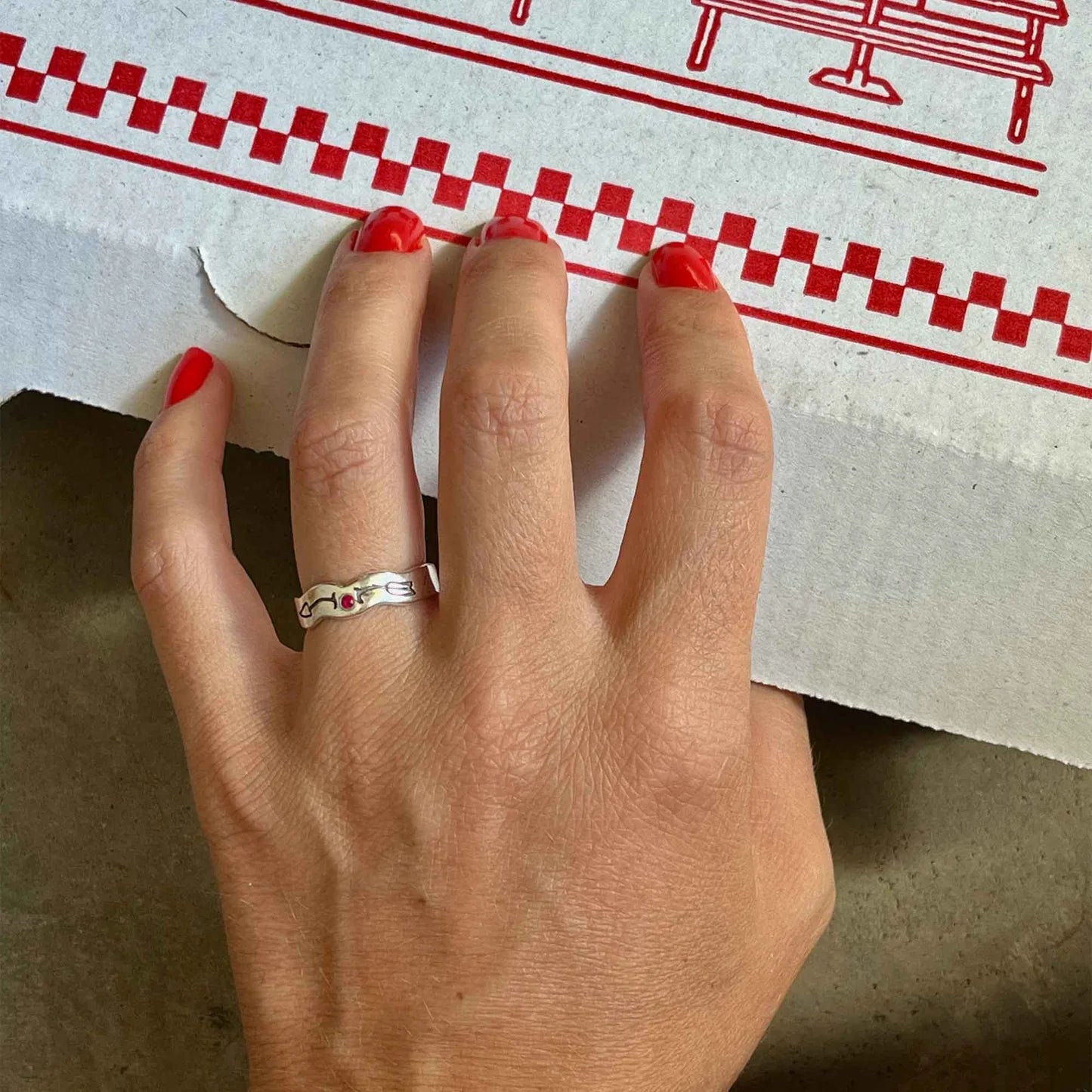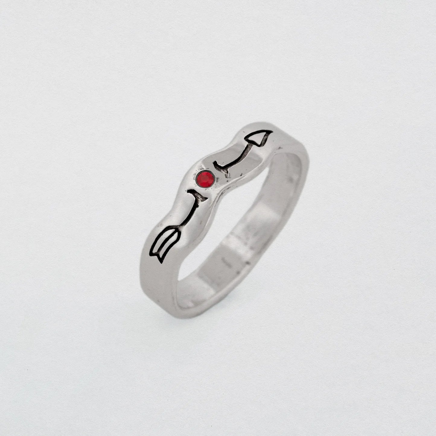 Style | A Wavy Band Ring With An Arrow Engraving Encasing A Ruby Stone |