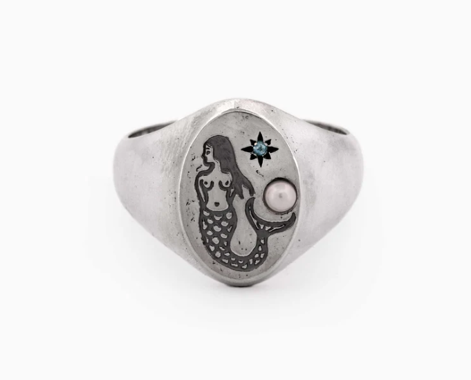 A Signet Ring With Mermaid Engraving & A Pearl |