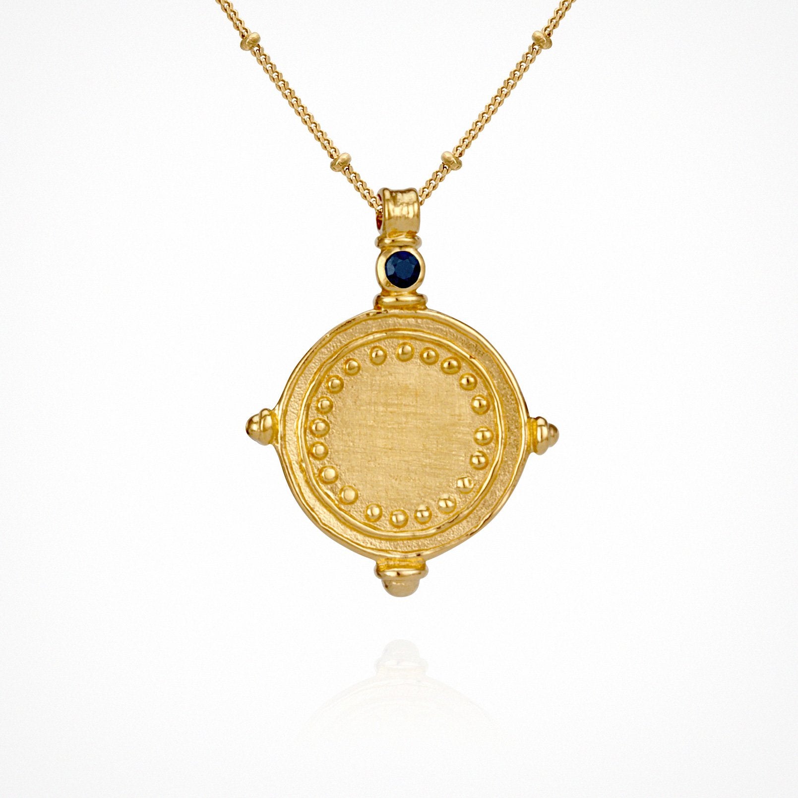 The Sura Necklace in cross-brushed 18K Gold Vermeil is reminiscent of an ancient coin with its embossed detail and circular shape. A faceted oval sapphire at the tip of 4 symmetrical points completes the design. Set upon a fine chain enhanced by delicate gold bead elements.