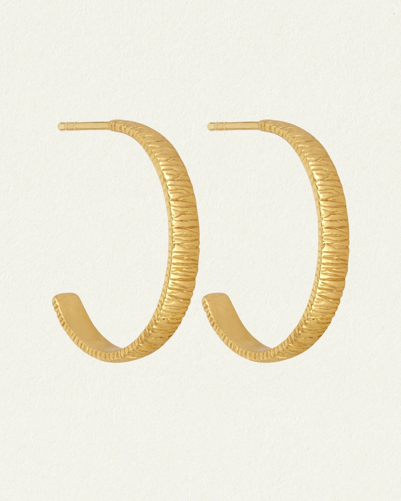 Tactile artistry forms textural mid-sized hoops in 18k gold vermeil. The open hoop design embodies possibilities, inviting us to trust in the endless potential for renewal and transformation.
