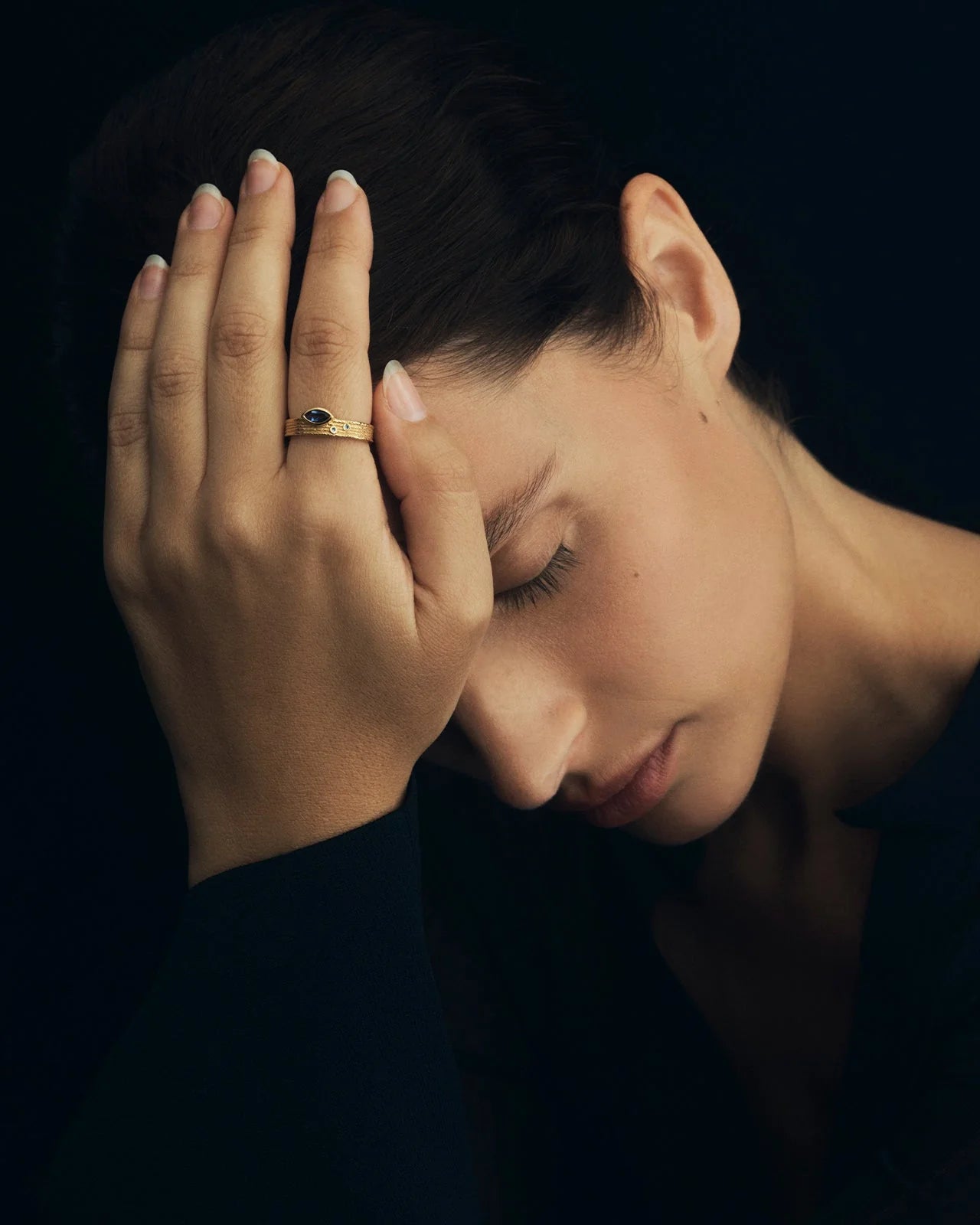 The Alessandra Ring, with its evocative evil eye design, features a marquise-cut iolite accented with a pair of dark blue sapphires.