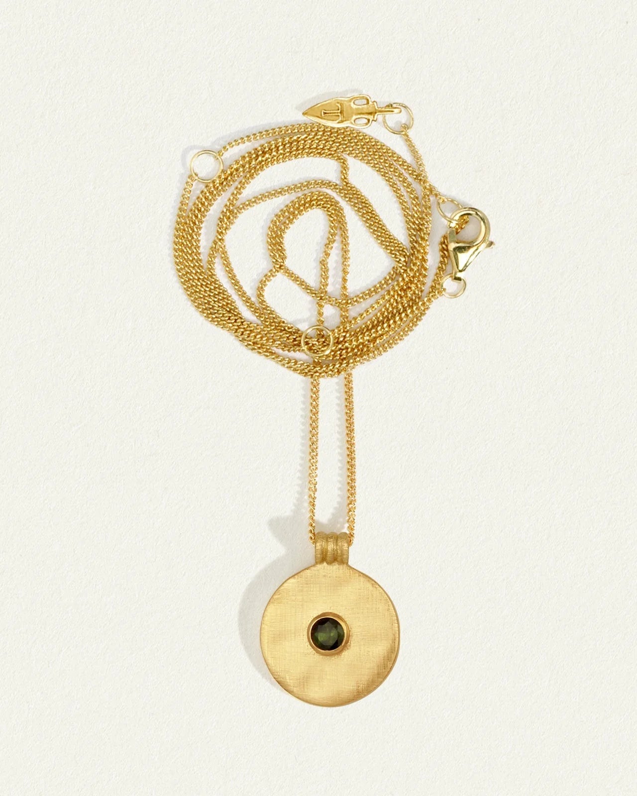 The rippling surface of this 18k gold vermeil coin pendant enfolds a captivating green tourmaline at its heart.