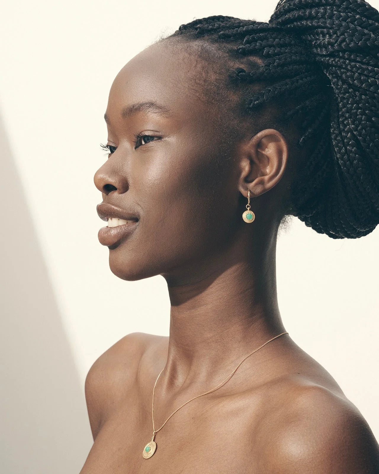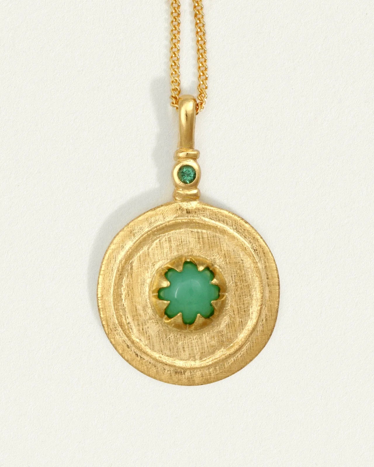 The Cora Necklace is a softly brushed coin necklace of 18k gold vermeil. The round pendant features an Australian chrysoprase gemstone set with a radiant star design, inspired by ancient Turkish, Bedouin and Berber jewellery.