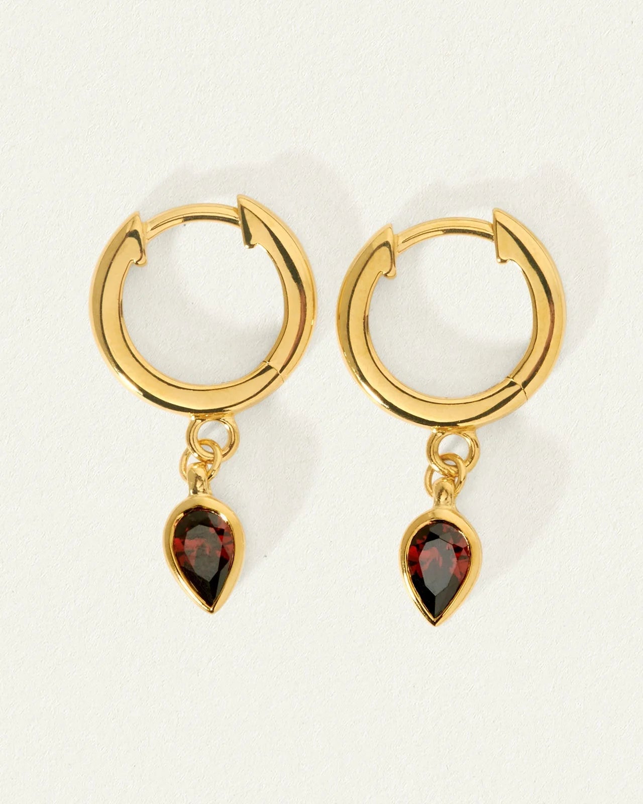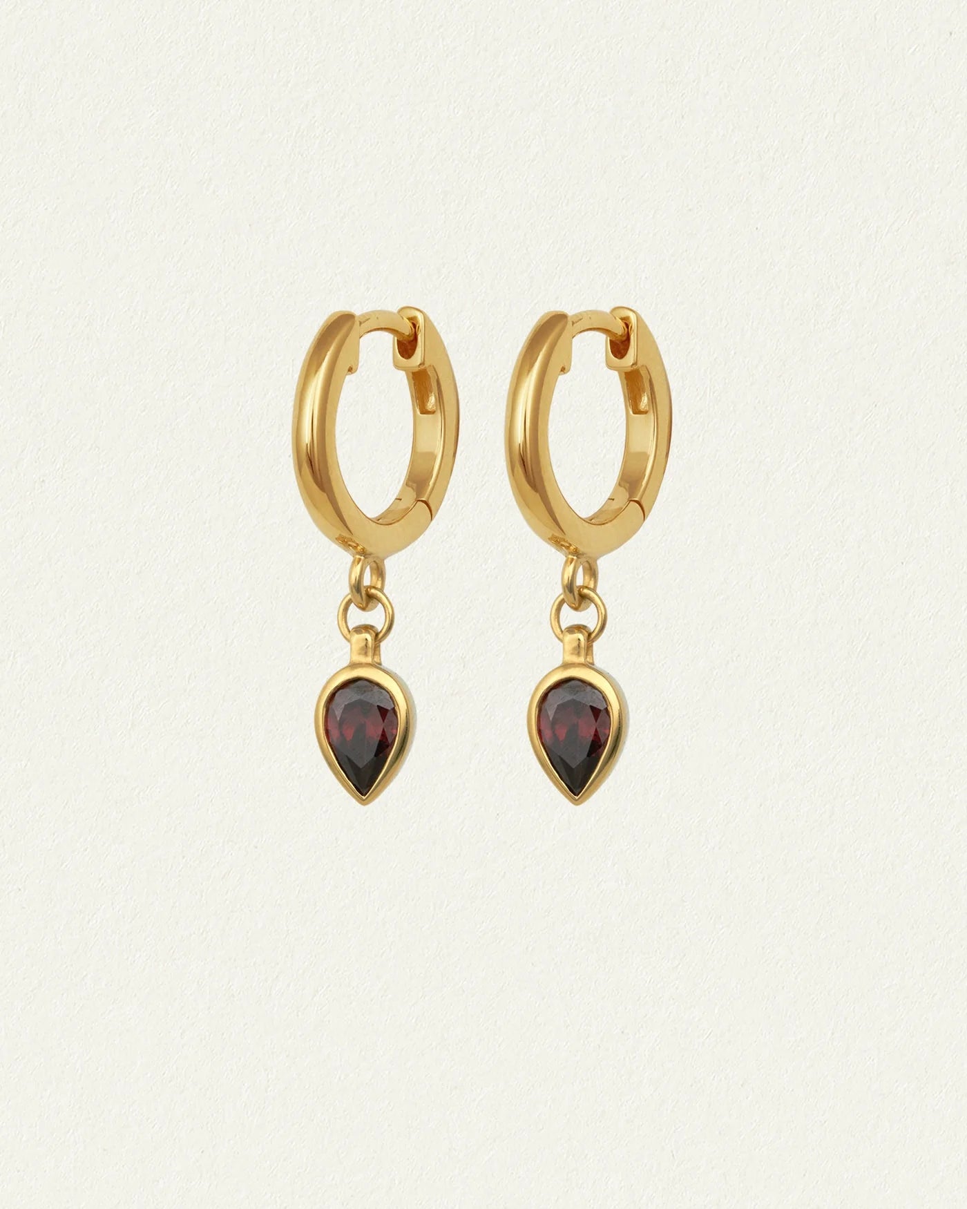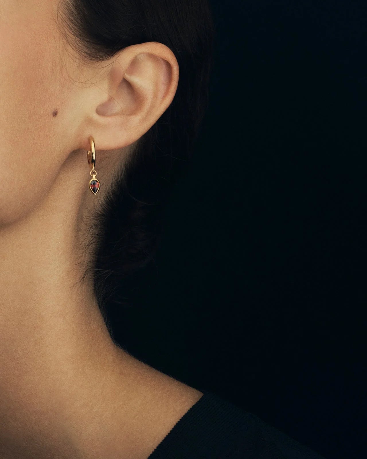 The Flame Earrings cast a warm glow, each adorned with a pear-cut garnet, reminiscent of a flickering flame. Set in 18k gold vermeil and clasped with a huggie closure, these drop earrings offer an ideal silhouette to enhance an ear stack with their smouldering allure.