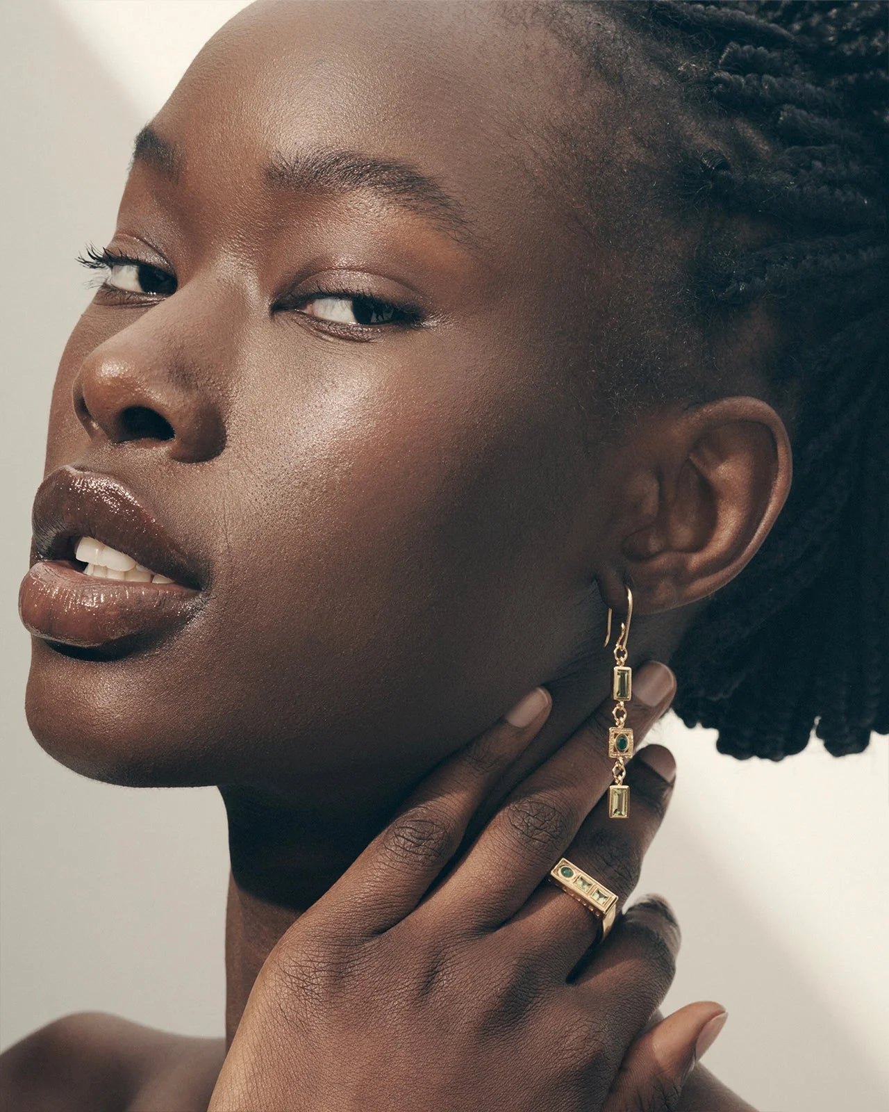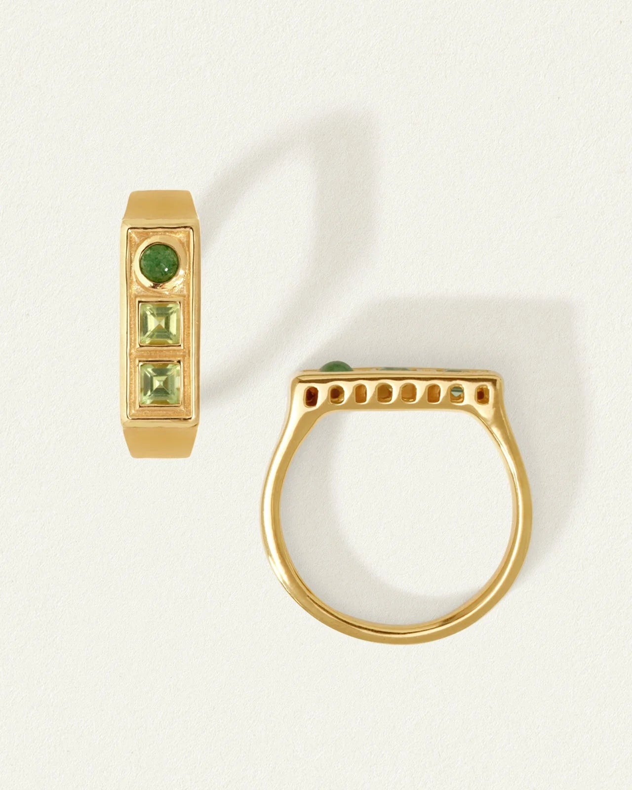 The Florence Ring is an 18k gold vermeil band-style signet ring set with a pair of princess cut peridot and a single green aventurine cabochon.