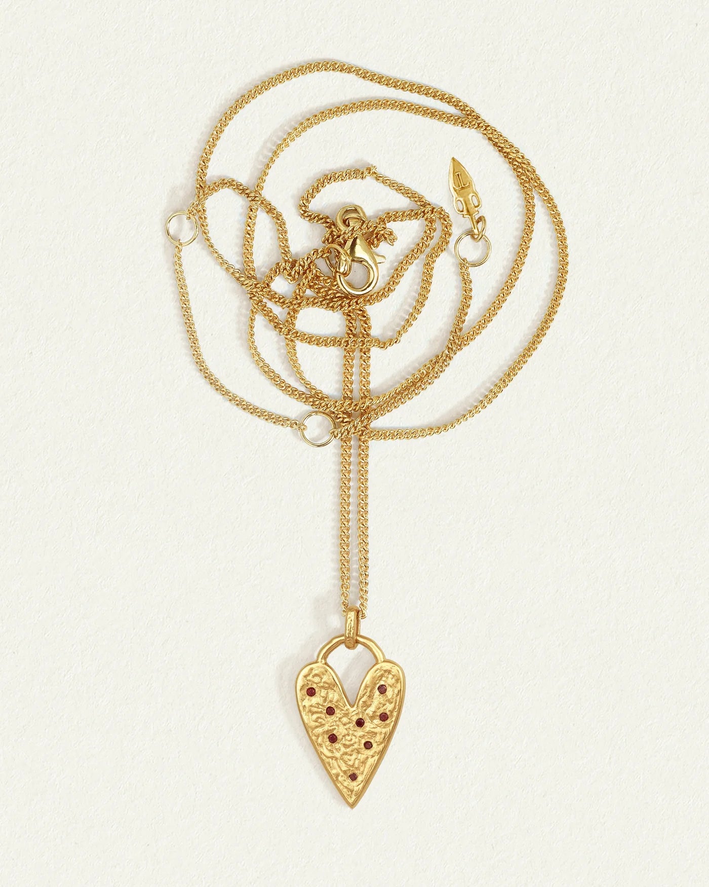 This subtly textured pendant is flecked with garnets, representing the throes of passion. These fiery gemstones add a touch of warmth to this heart necklace, embodying the spirit of love.
