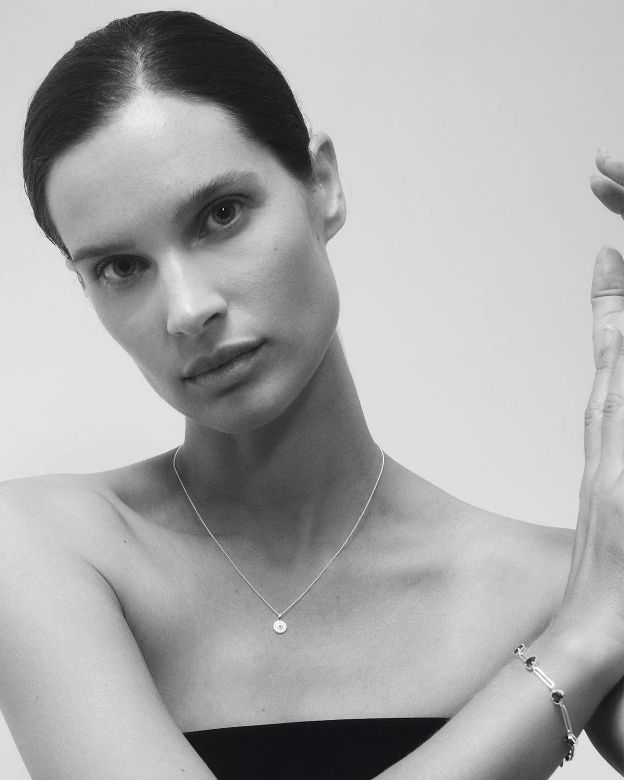 A delicate reimagining of the classic coin pendant, the Mina Necklace features an 8mm pendant cast from recycled sterling silver. At the heart of the softly textured pendant shines a natural emerald, symbolising new beginnings.