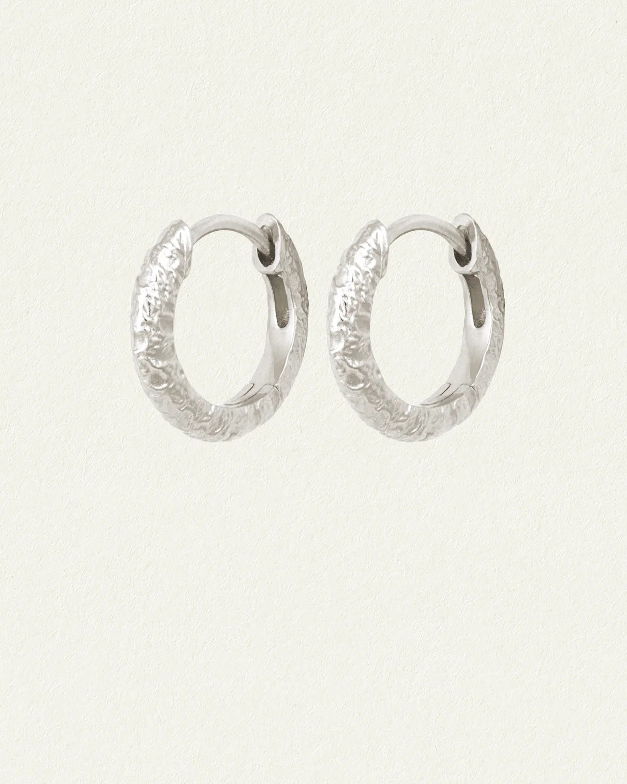 These recycled sterling silver small hoop earrings capture the essence of molten lava. Their richly textured surface and compact size make them perfect for stacking.